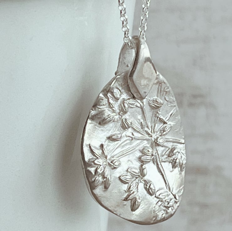 This pendant was created from a series of moulds I made from flowers and plants in my garden over the course of a year. The dill plant is a particular favourite as it creates interesting details . I like the fact that taking inspiration directly from nature gives us a point of connection and grounding to the natural world.