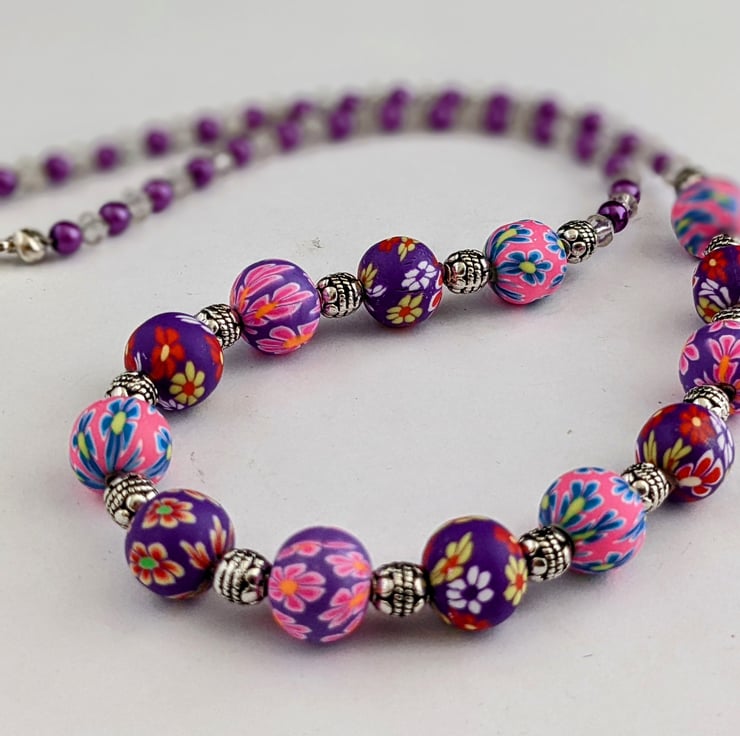 18" necklace of 10mm pink and purple Fimo beads and 4mm magenta glass pearls with Tibetan silver spacers. In an organza gift bag.