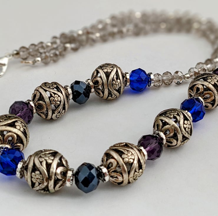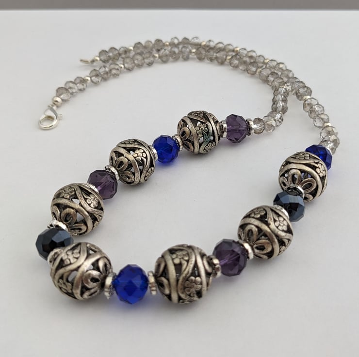 20" necklace of 8mm blue and purple faceted glass beads with 15mm heavy duty Tibetan silver embossed beads and 6mm silver faceted glass beads. In an organza gift bag.