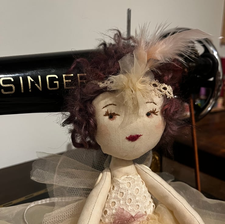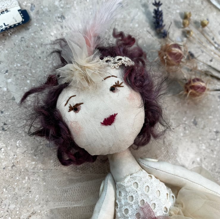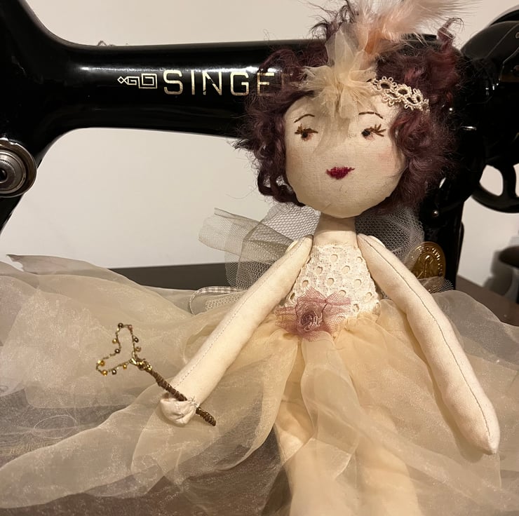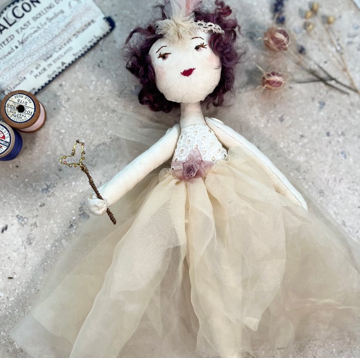 Ruby’s body is made from reclaimed cotton which has been dyed with tea and filled with polyester filler. Her face is painted and embroidered by hand and she is dressed in a mix of fabrics - a tattered old chiffon scarf and broderie anglaise trim. Her hair is Gotland wool fleece and she wears a headdress made from handmade lace, chiffon and a feather. She carries a beaded wand.
