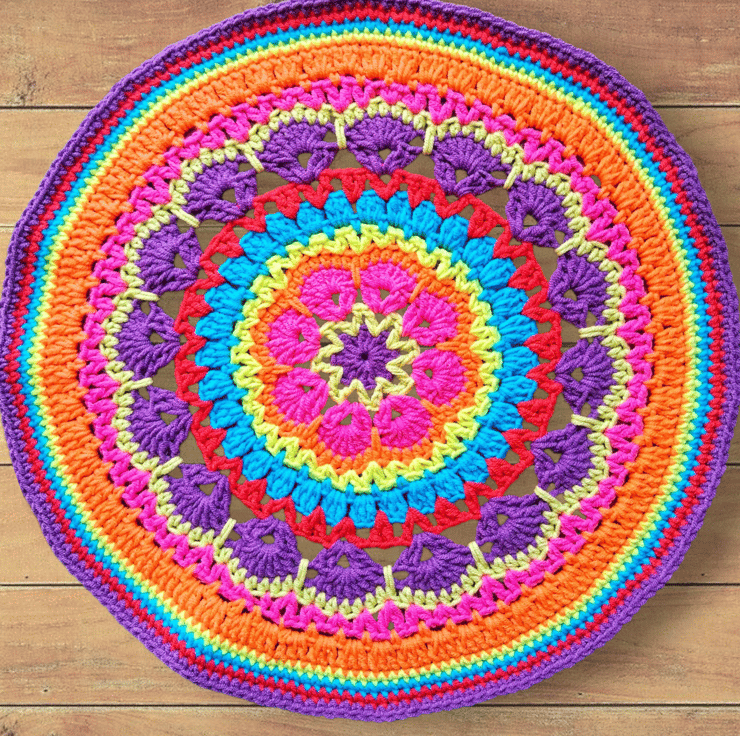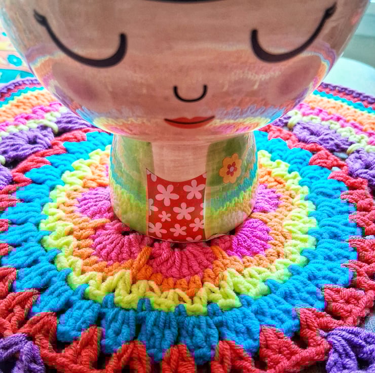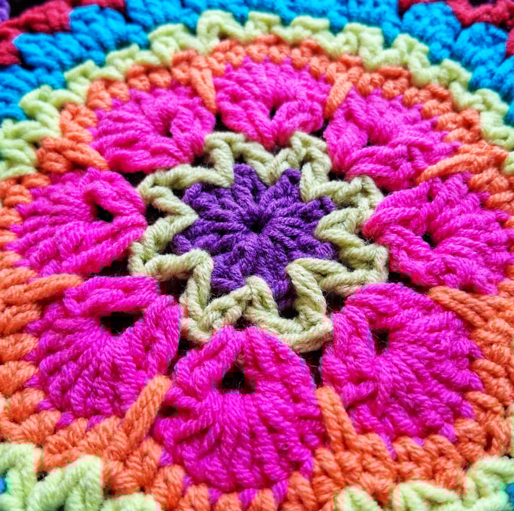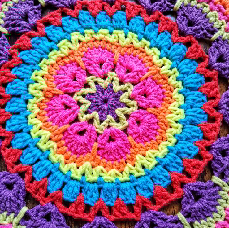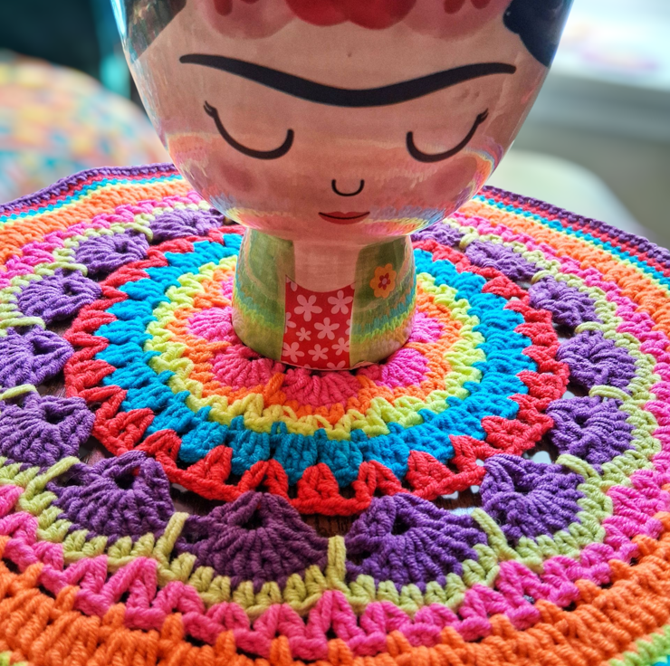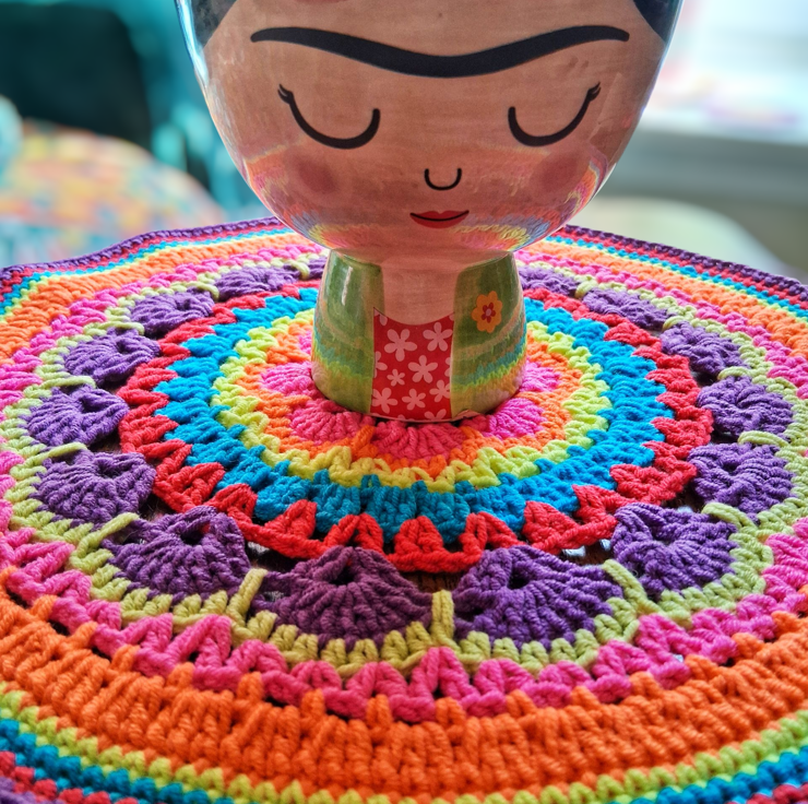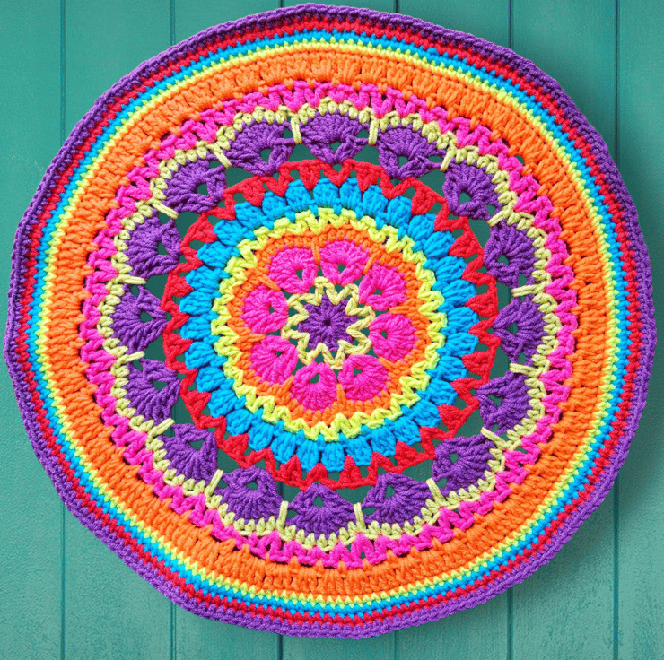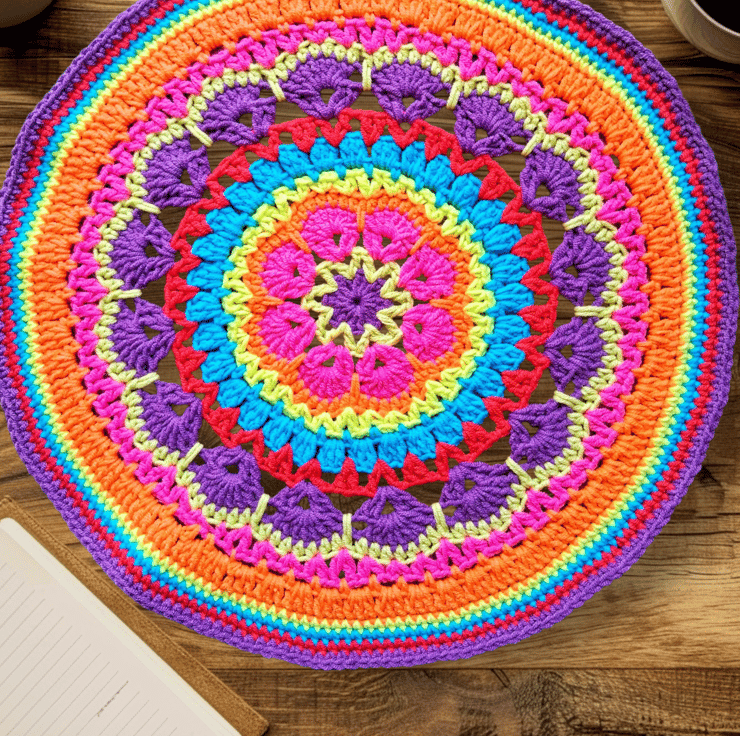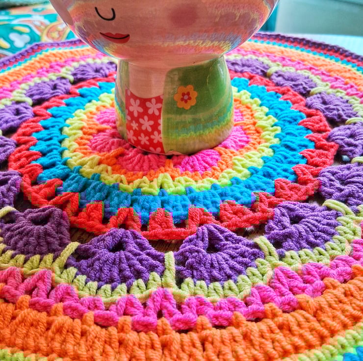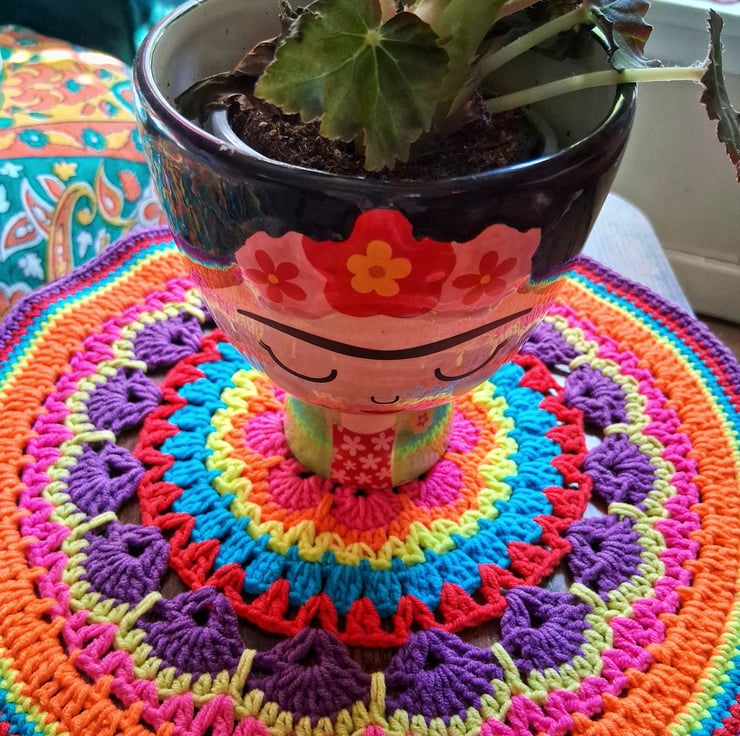 Bright crochet mandala doily. 30 cm in diameter. Perfect for giving your table a pop of colour. Crocheted in vibrant cotton blend yarn to maintain colour and ease of wash.