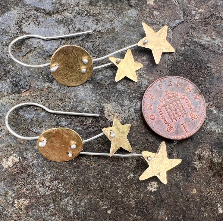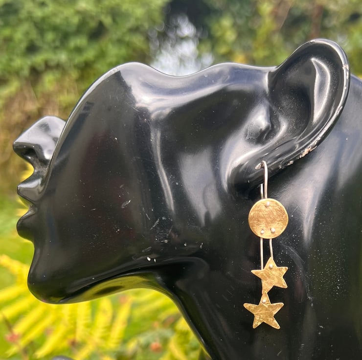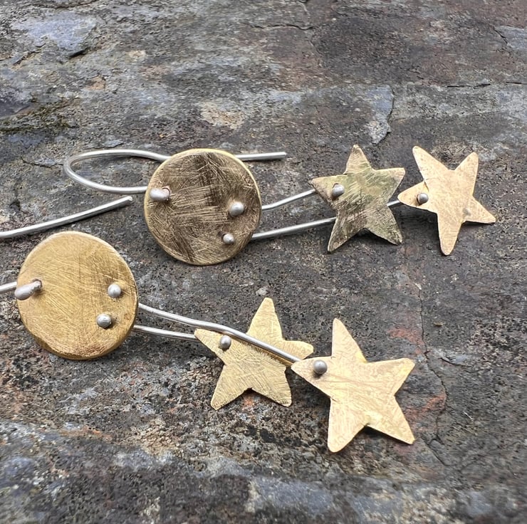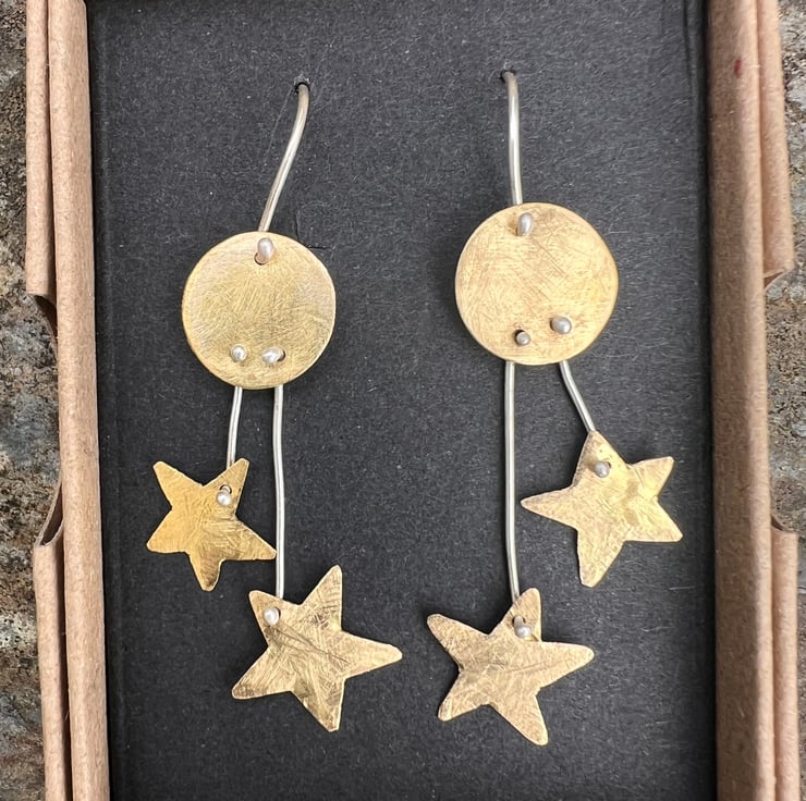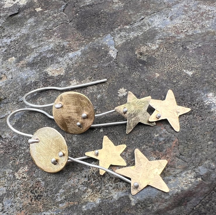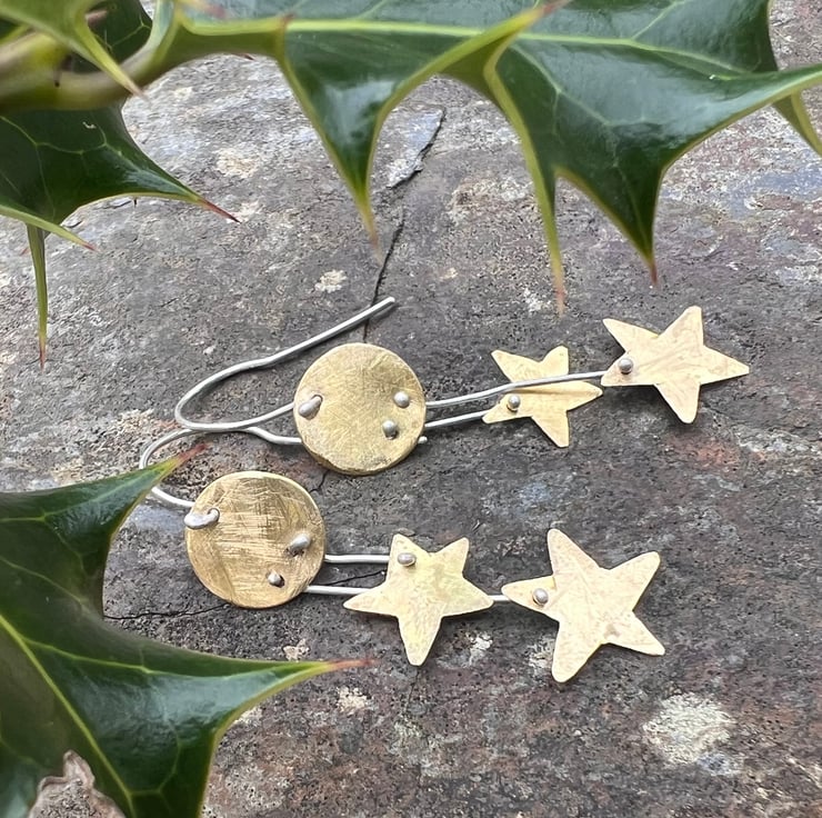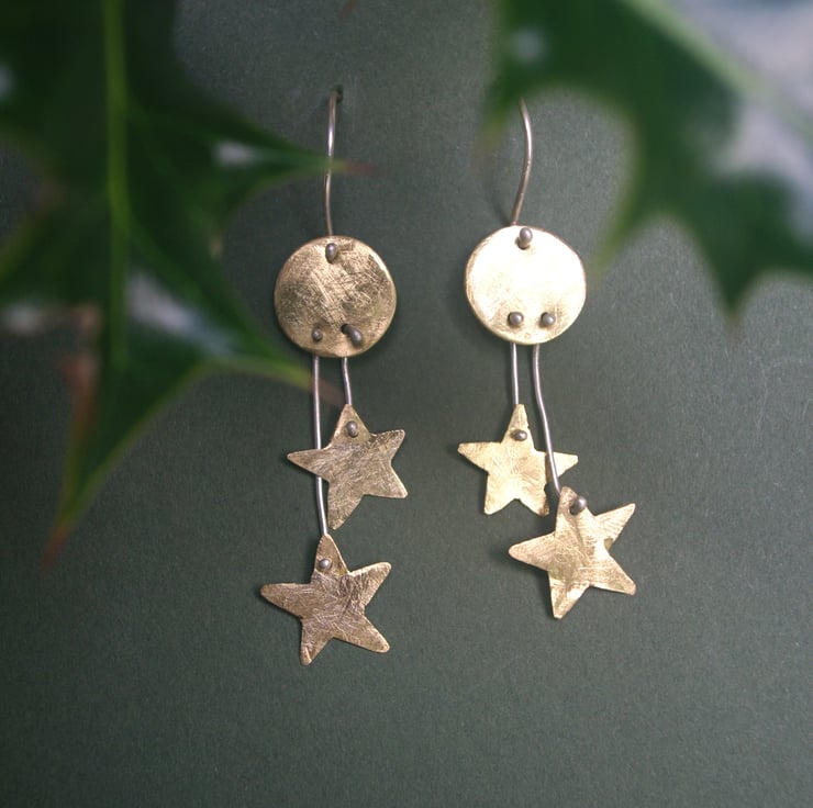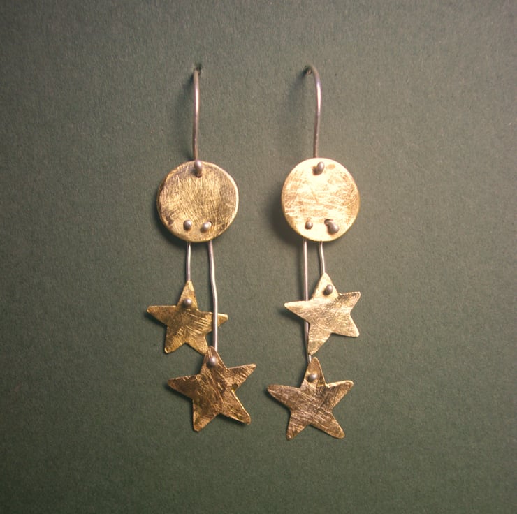 Stars and moon Christmas earrings. The stars have been cut out by hand and have 5 points. They are not perfectly symmetrical so each one is unique. The brass has a matt/frosted texture with 2 stars dangling from each earring at different lengths. They hang from the brass round disc , with silver wire , so that they can move about freely and catch the light as they do so.
