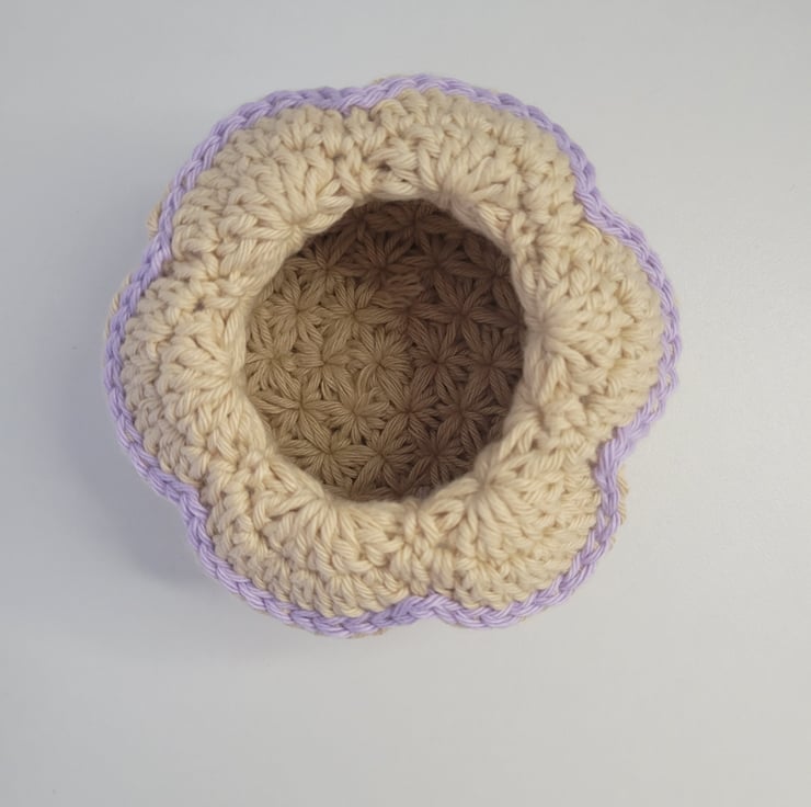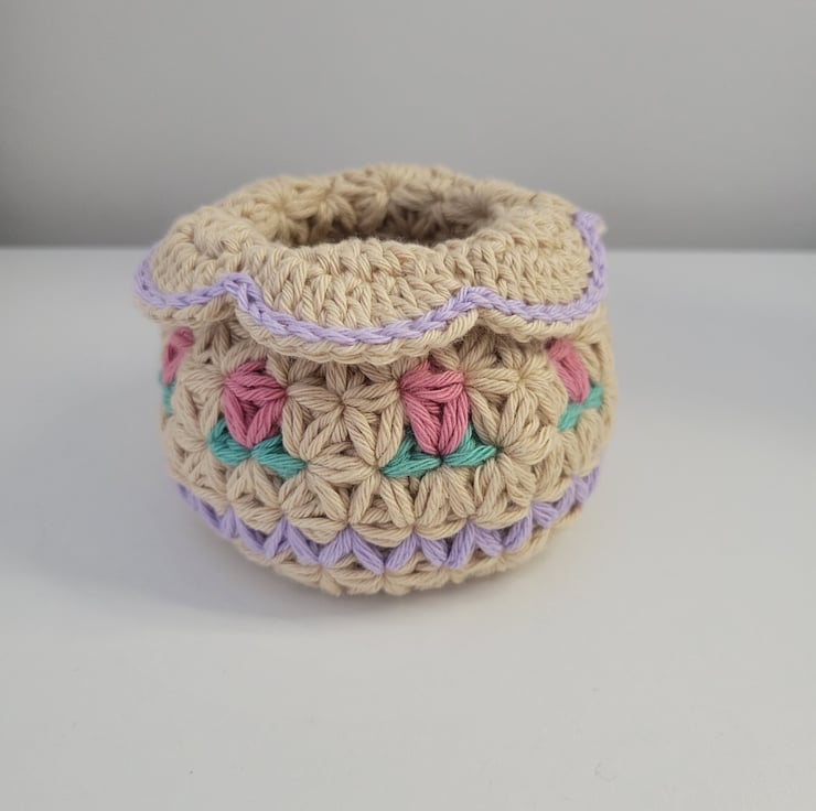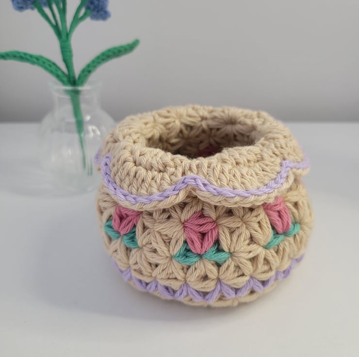 Add a touch of handmade charm to your space with this beautifully crafted crochet accessories basket. Made with soft, durable cotton yarn, this basket features a stunning blend of pastel shades, set against a warm beige background. Its delicate petal-like stitching and ruffled edge create a cozy, whimsical look perfect for any room.
