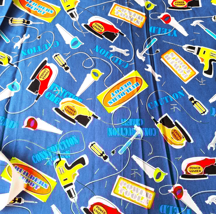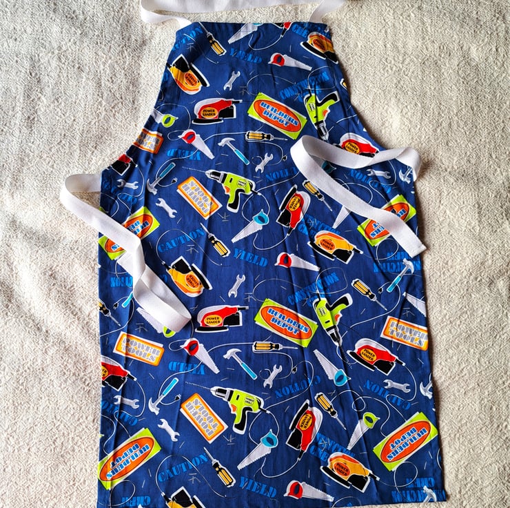 This apron is made from unusual deep blue quilting cotton fabric, printed with power tools and scattered hand tools. There are sanders and drills, saws, screwdrivers, hammers and spanners against a background of appropriate wording, such as 'construction crew' and 'builders depot'. The straps are acrylic herringbone. The apron is 27.5" (70 cm.) from neck to hem and 17" (43 cm.) at the widest point. It fits a child from approximately ten to sixteen years, or a small adult. It is machine washable.