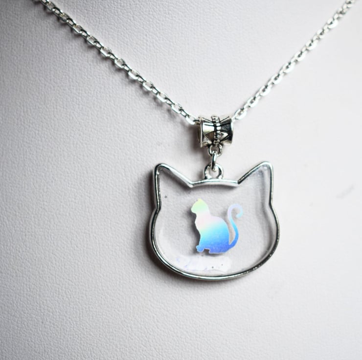 The cat face shaped pendant is filled with layers of resin and this dainty cat design that really catches the light! I have hung this from a silverplated chain that fastens with a lobster claw clasp. You can choose the length of chain from the drop down menu, or if you would like a length of chain not offered just get in touch and I can make one just for you!