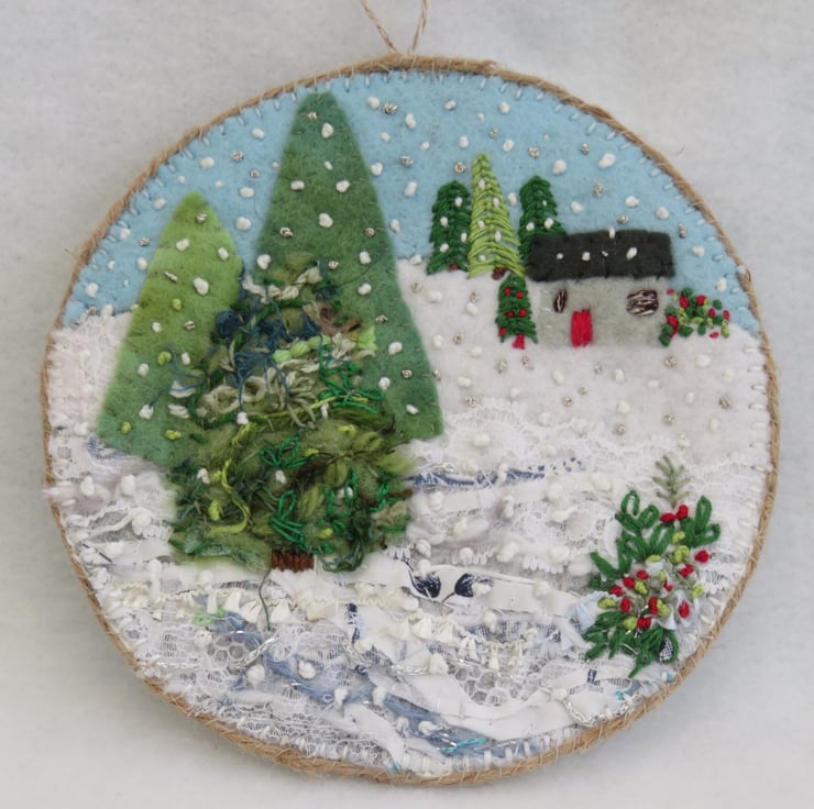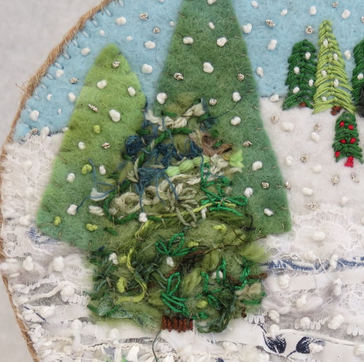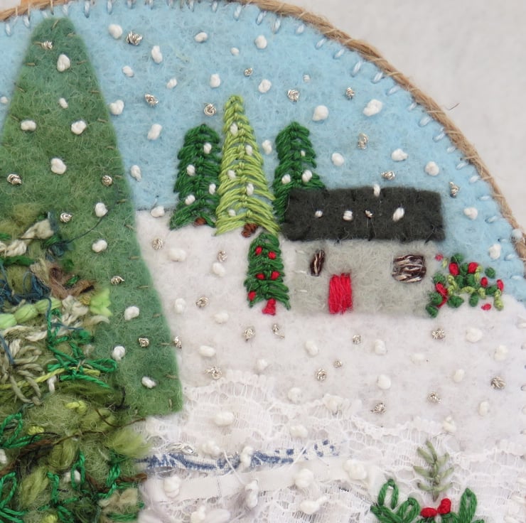 Details of the design have been stitched in threads and fine wools, some of them vintage. A hint of frosty snow has been created with silver metallic thread. A fancy yarn with a metallic thread gives a golden glow to the windows. The snowy field is cut from white felt and overlaid with lace. The foreground has been cut from hand made 'art fabric' created from snippets of lace, yarn and fabric snippets. The conifer in the foreground has been cut from a second 'art fabric' composed of green wool fibres, with a sprinkling of yarn and thread offcuts and hand embroidery. White and silver snowflakes are stitched over the scene.