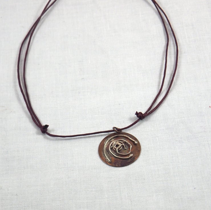 A copper jump ring is attached to the ring at the top of the disc it is then hung on a fine, round, red, cotton cord, the cord has two sliding knots so it can be adjusted for length. The longest is approximately 72 cm and the shortest approximately 40cm.