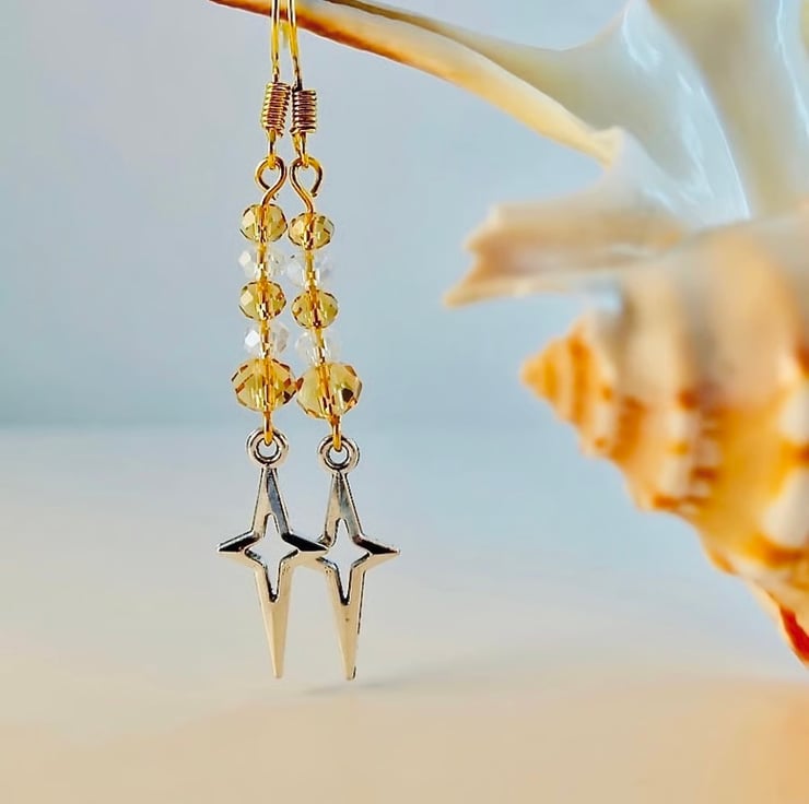 Each sparkly earring features a 23x10mm silver plated open star, topped with five golden sparkly faceted glass beads and hung from gold plated ear-wires.