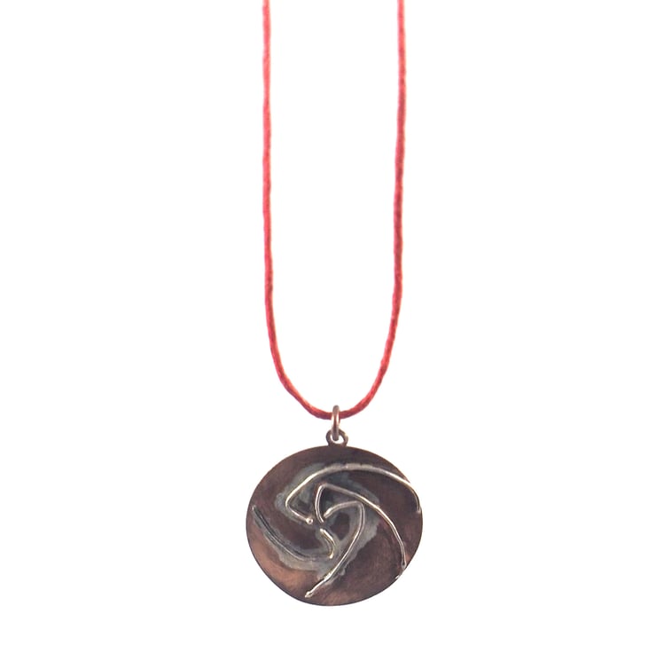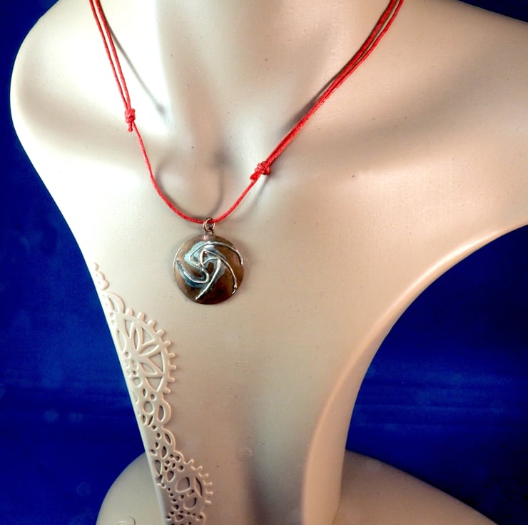 A copper jump ring is fixed to the ring at the top of the disc and the pendant it hung on a fine, red, cotton cord, which is adjustable via two sliding knots. The length can be adjusted from approximately 70cm down to aproximately 40cm.