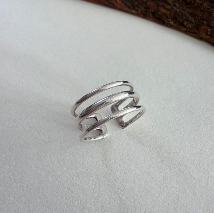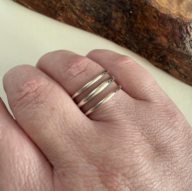 A handmade recycled sterling silver ring that is made to give the illusion that it is 3 separate rings.