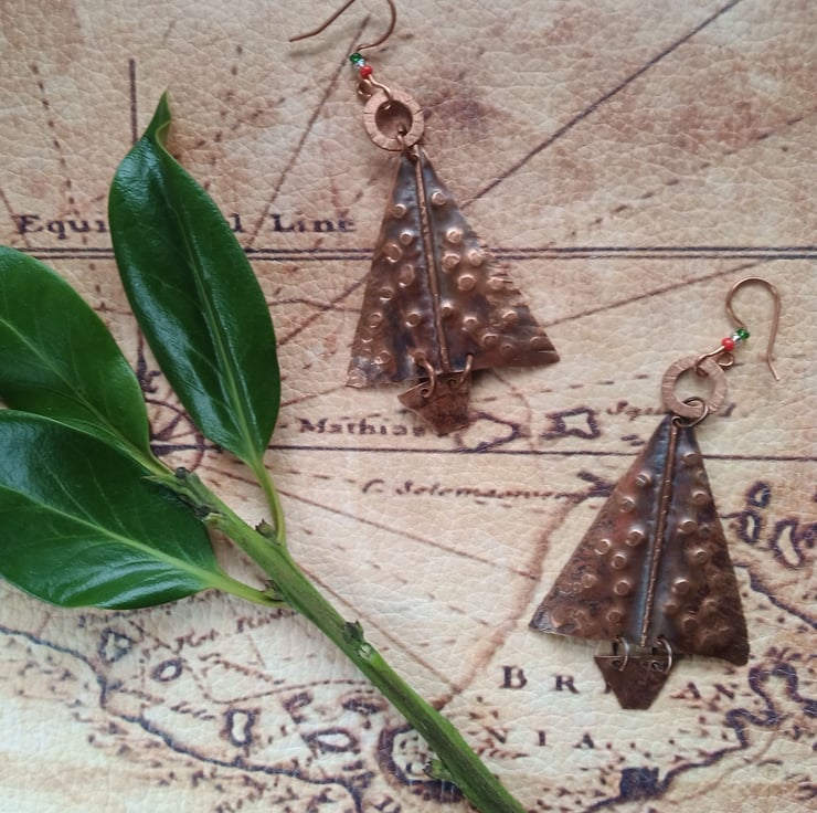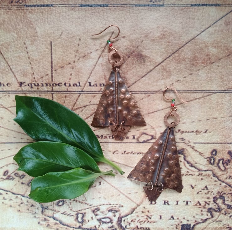 Beautiful incredibly lightweight earrings created from copper foil which has been folded and hammered to add textures, annealed, opened and hammered again before being shaped. Textured copper washers add another design element and add extra movement. Finished with an antique patina polished and sealed with a silicon wax polish. They have handmade copper ear wires with tiny coloured seed beads for a touch of sparkle.