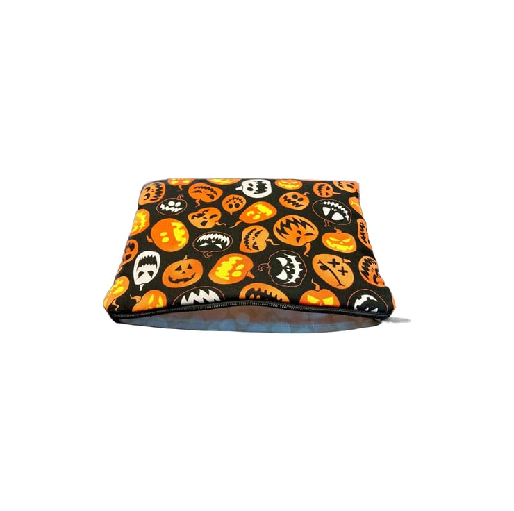 Glow in the Dark Jack O Lantern and Evil Faces Project Bag & Pouch Set made from Robert Kaufman Lights Out fabric with a complimentary Glow in the Dark Bumbleberries lining. All items are padded for extra protection and feature a zip closure to the top to keep the contents safe.
