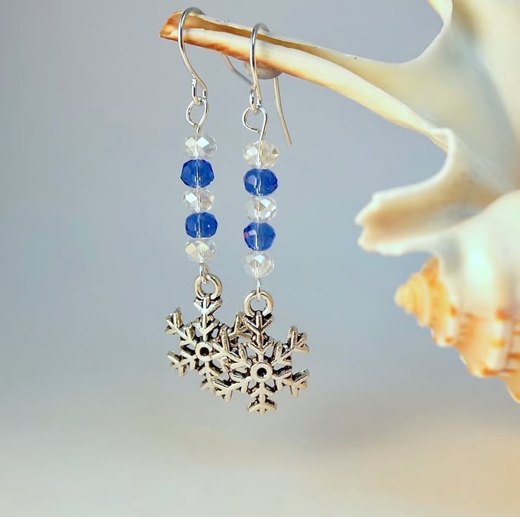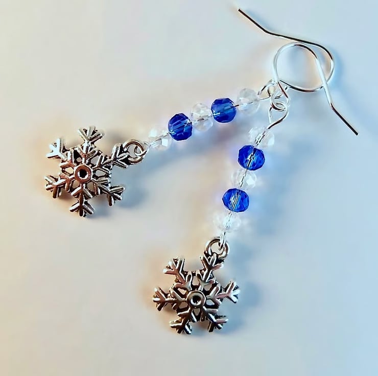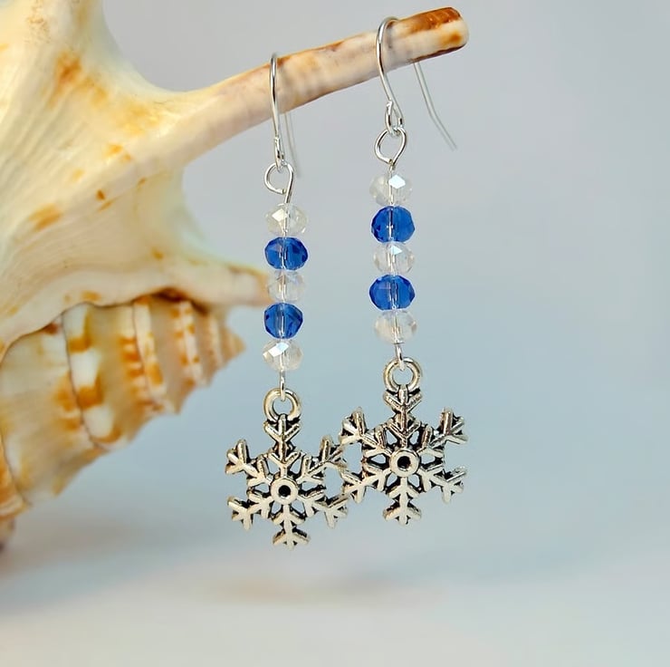 Simple but sweet little snowflake charms of Tibetan silver, measuring approximately 13mm, topped with sparkly glass beads in clear and ice blue, all hung from silver plated ear-wires.