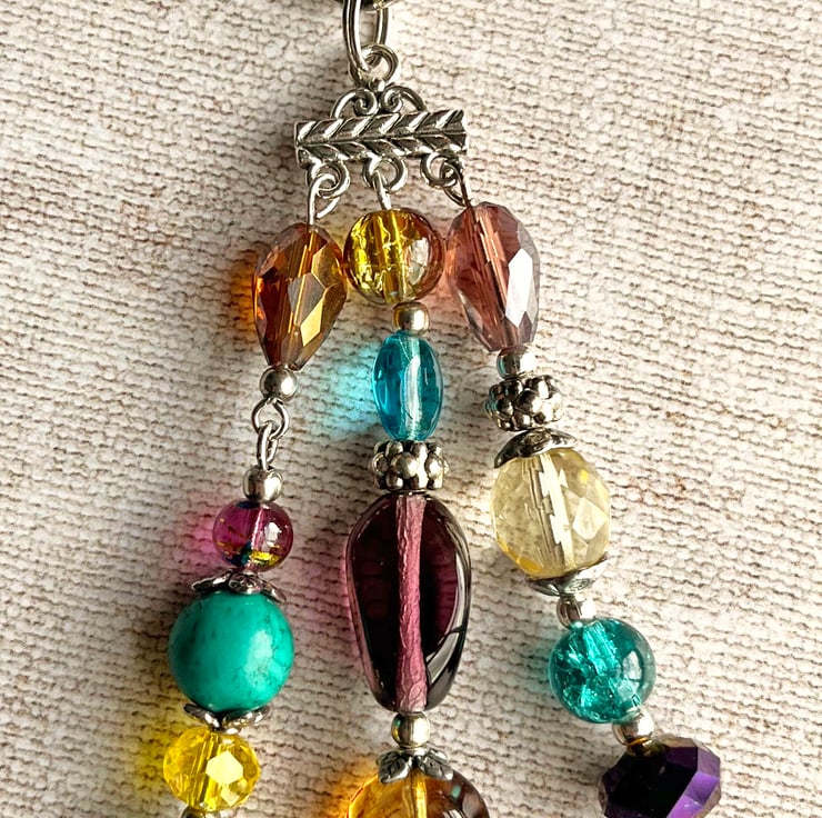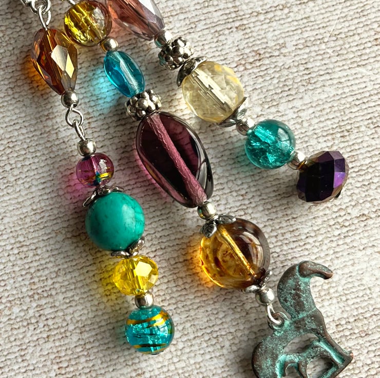 This bag charm features a double-sided Greek Mykonos verdigris charm of a mare and foal. I've used a large semi-precious Turquoise bead and an assortment of glass beads in shades of purple, turquoise and yellow along with Tibetan style spacer beads.