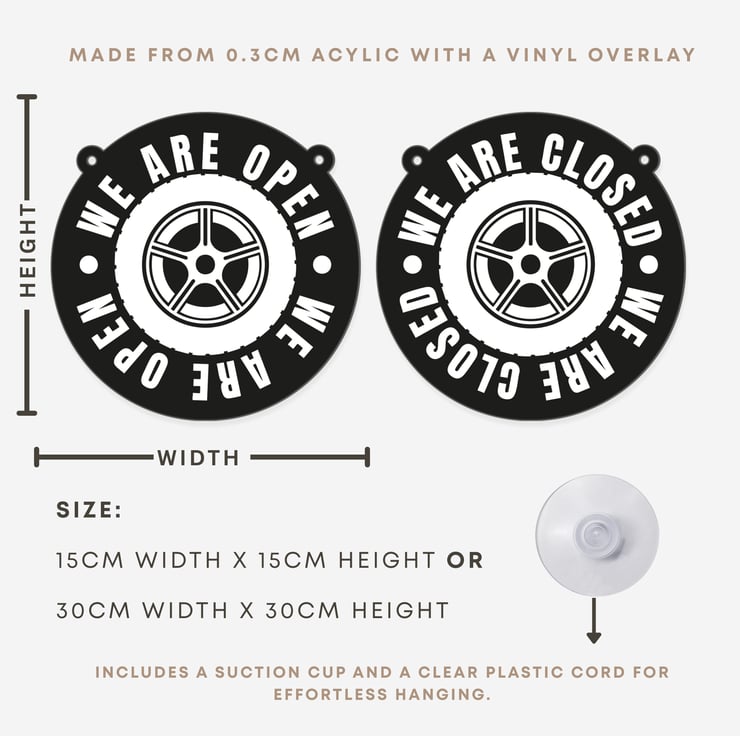 Bring a professional touch to your auto business with this round wheel rim open/closed sign. Its circular design and bold tyre rim graphic make it a perfect fit for garages, car repair centres, tyre services and MOT stations. Made from 0.3cm acrylic with a durable vinyl overlay, this sign is double-sided to clearly display “We Are Open” or “We Are Closed”. Includes a suction cup and clear cord for quick window display.
