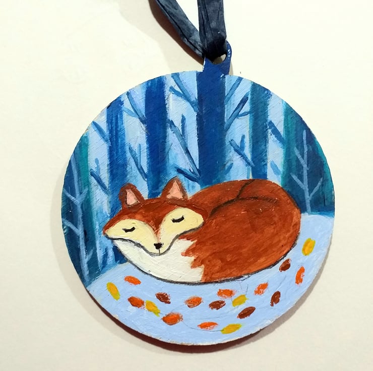 A pretty bauble showing a snoozing fox curled up in autumn leaves hand painted original design UK delivery only