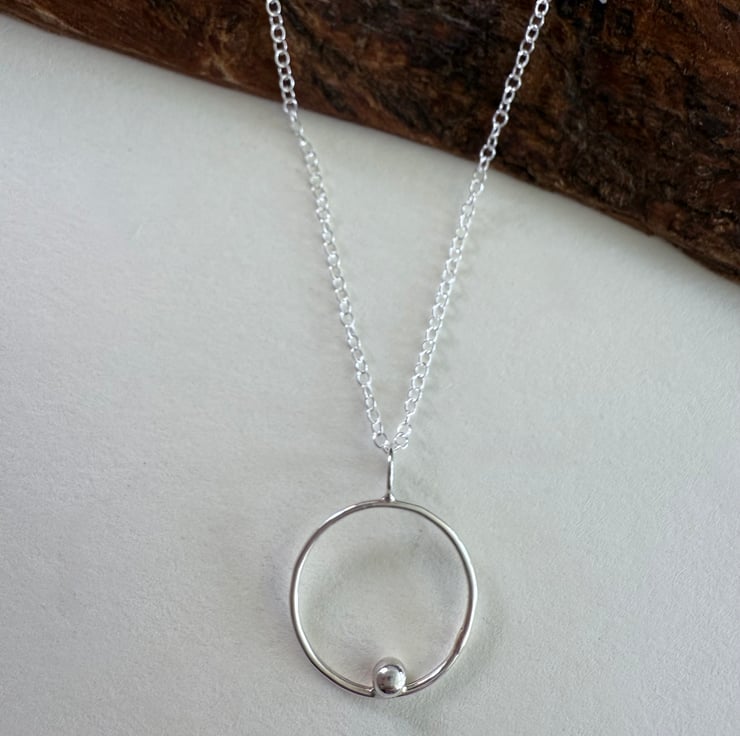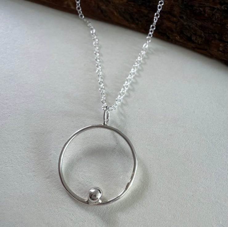 A simple but beautiful recycled silver hoop pendant with melted sterling silver adornment. Finished to a high shine and hung on a sterling silver chain.