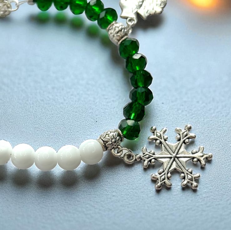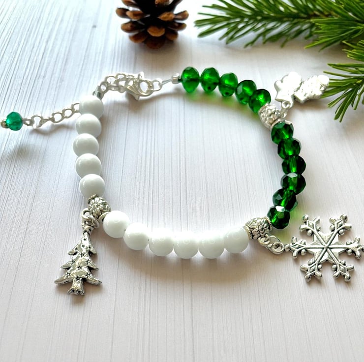 Sparkle and shine in the Christmas Season with this enchanting bracelet, featuring stunning 8mm white Chalcedony and vibrant 8mm green Crystal Rondelles, beautifully complemented with Christmas theme charms. This exquisite piece is not only a fashion statement but also a symbol of the festive season, making it the perfect accessory. The durable lobster clasp and added extender chain ensure a comfortable fit, while the bracelet arrives elegantly wrapped in tissue and nestled in a Christmas-themed Organza gift bag, making it an ideal gift for loved ones or a delightful treat for yourself.