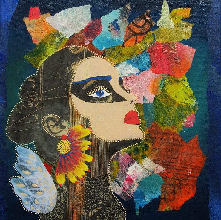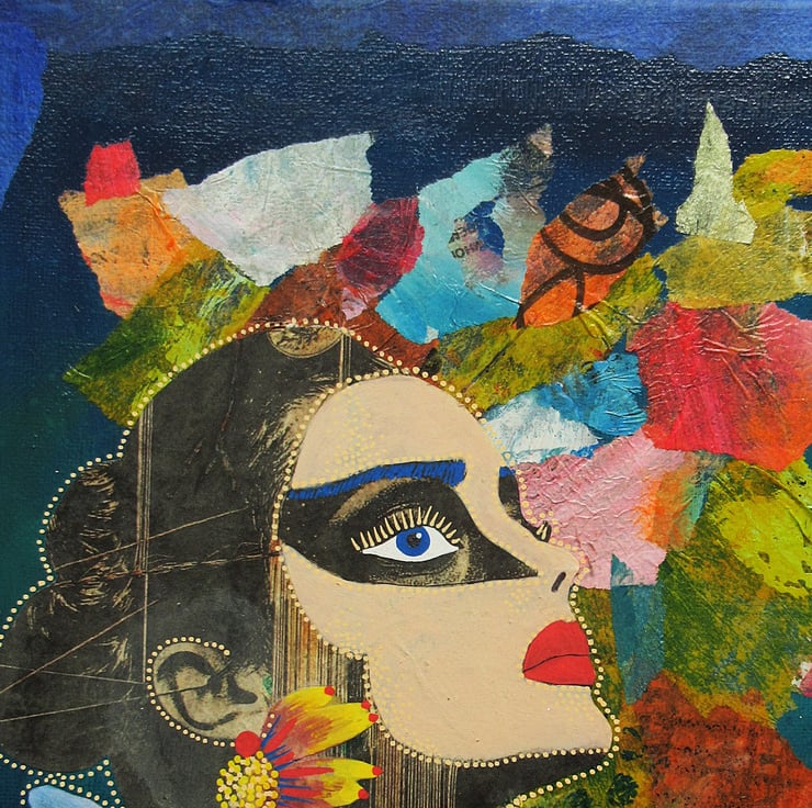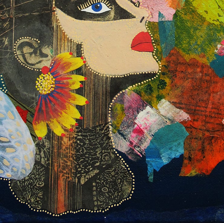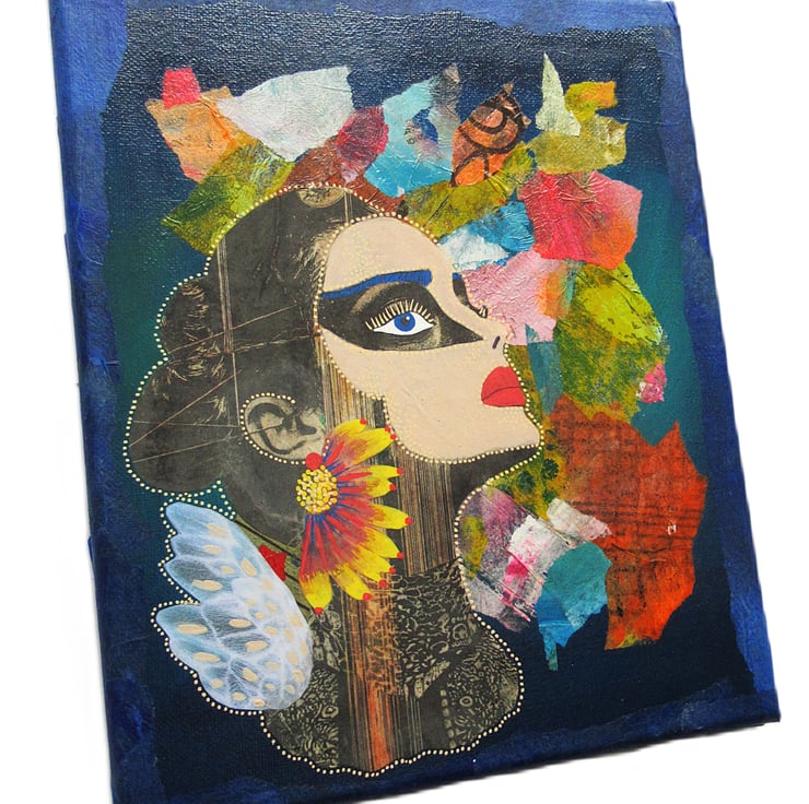 Surreal, abstract 10x 12 inch OOAK artwork in acrylic, collage and drawing pens on canvas with painted edges, so no framing is necessarily required. This striking artwork has a captivating female portrait with a mask effect on the face giving an enigmatic sense to the work. Look closer and discover the intricate details that make this art piece so unique - bold, textured collage of layered torn paper in vivid shades which contrasts with the darker background and the large flower the woman wears as an earring giving her an ethereal, nature-inspired look. This unusual artwork is perfect for anyone looking to add a touch of bold, surreal style to their interior. It will be discreetly hand signed by Bea before shipping.