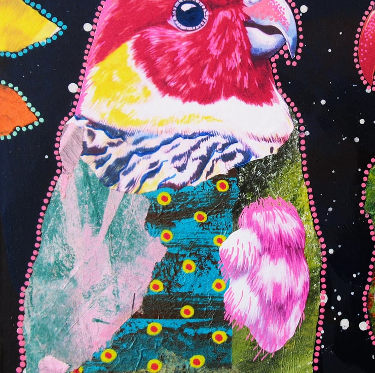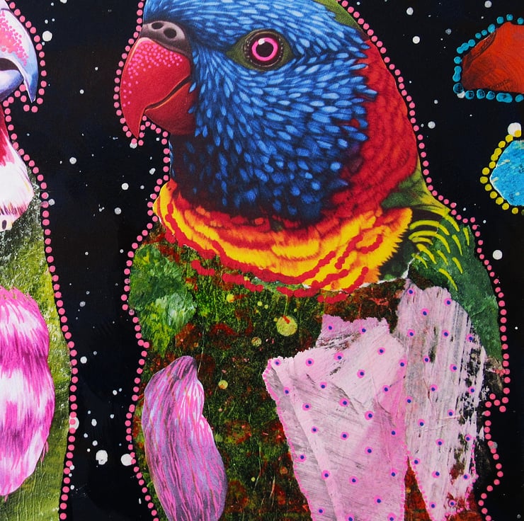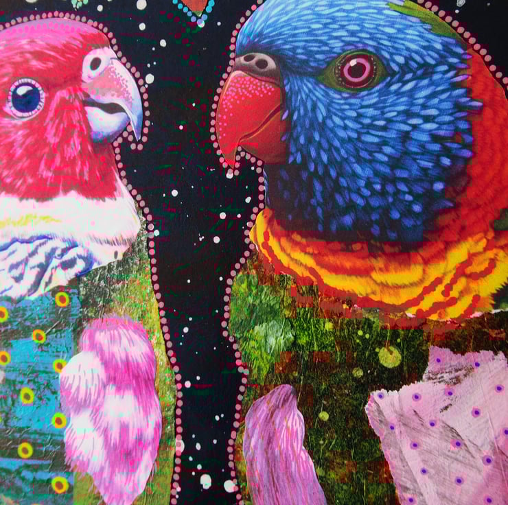 Whimsical Parrots Painting Acrylic & Collage Surreal Colourful Nature Artwork