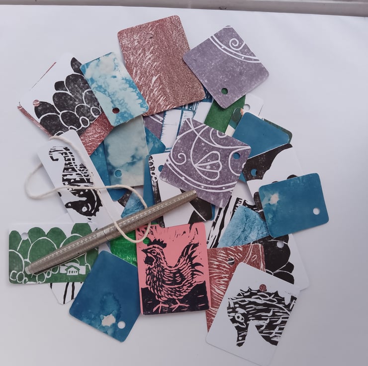 Your presents will look great with these handmade tags! Each pack of 20 will contain a random selection of handmade pieces. They are made from sturdy card or paper, trimmings and offcuts from my original artwork. Choose from patterns and motifs, or words. Each one is handcut, with rounded corners and punched holes for a ribbon or string.