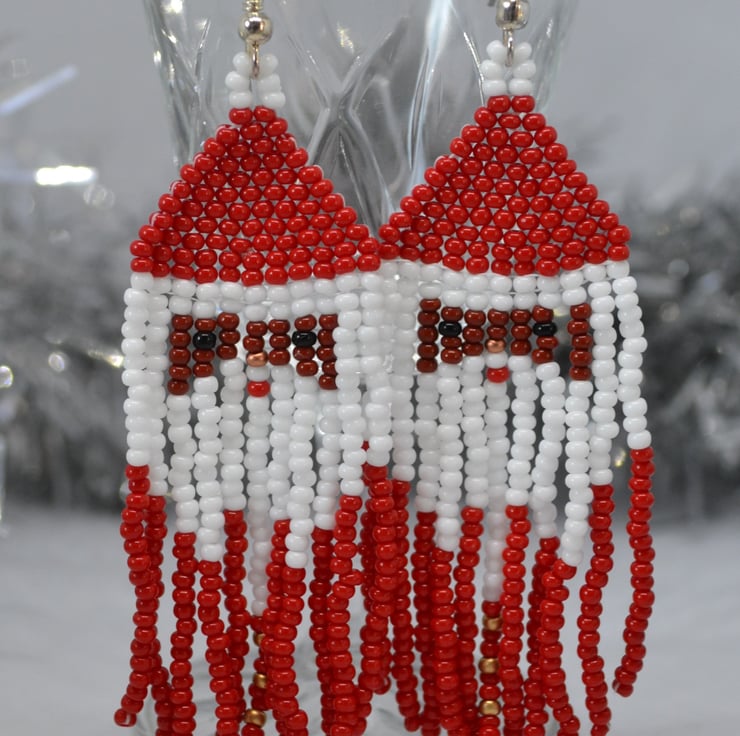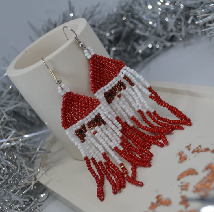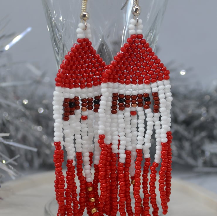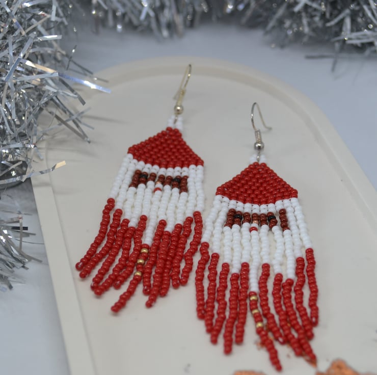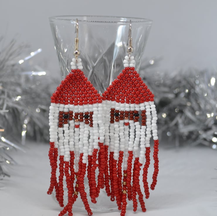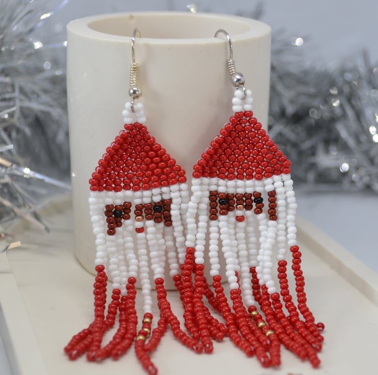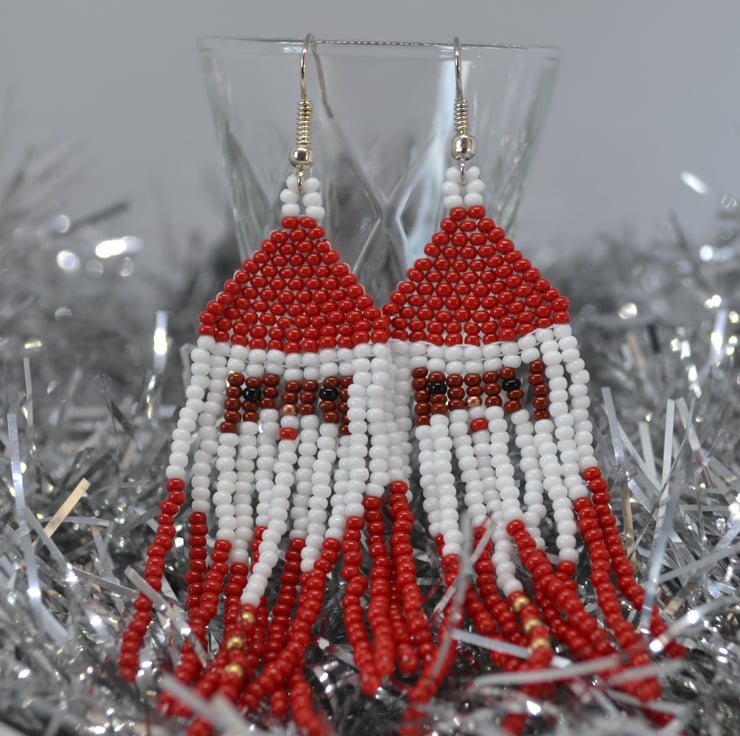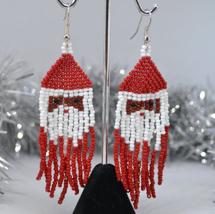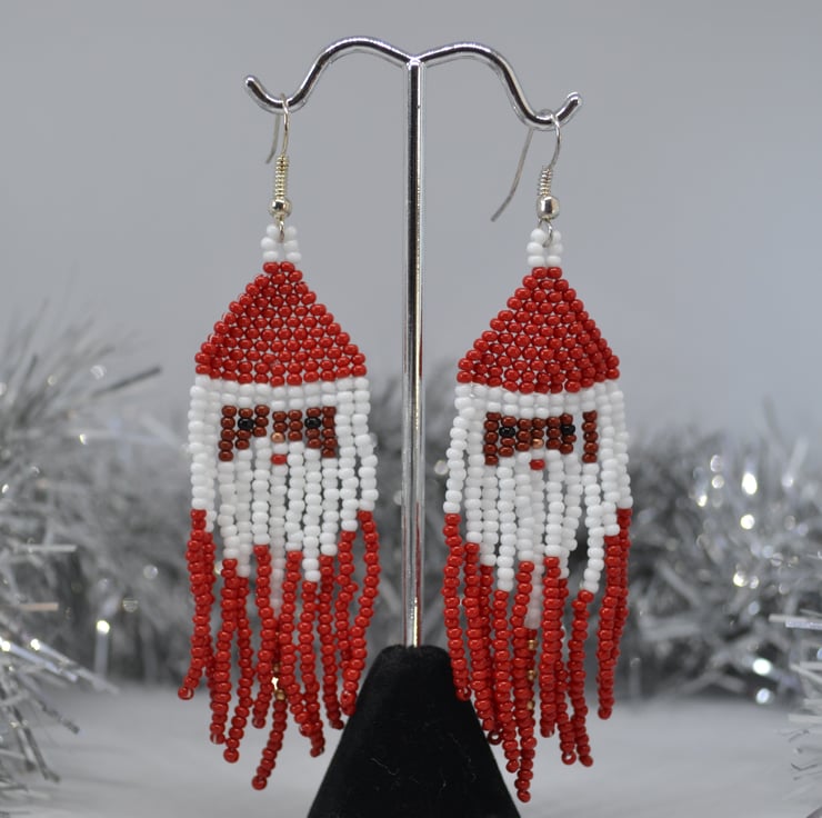 These long tassel beadwork earrings are made using Czech glass seed beads. These Santa's aren't just for Christmas Day, but can be worn throughout the festive season. They are approx. 7.5cm in length from the base of the ear wire and are approx. 2.8cm wide. The ear wires are silver plated but can be changed at checkout to rhodium plated or sterling silver for those with allergies or just personal preference.