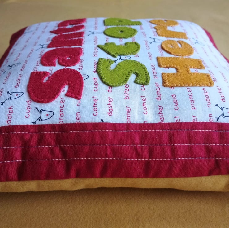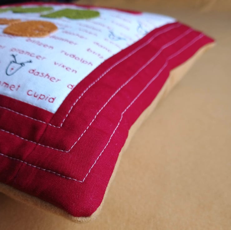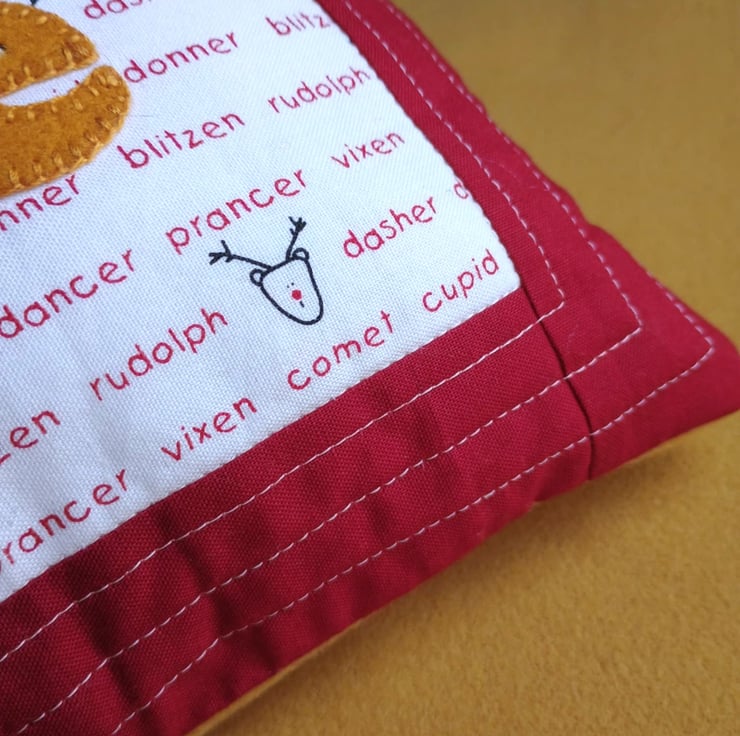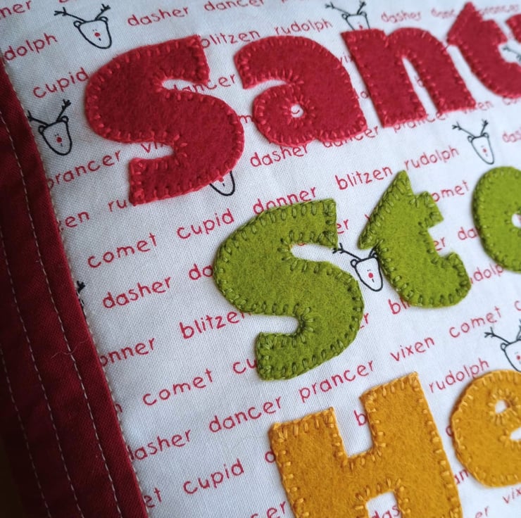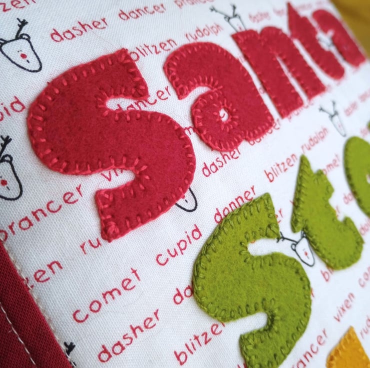 I hand cut letters in red, green and gold wool felt and hand appliqued them with blanket stitch to a fun festive fabric covered in the names of Father Christmas's reindeers. There's Dasher and Dancer, Prancer and Vixen, and Comet, Donner and Blitzen. And of course Rudolph.