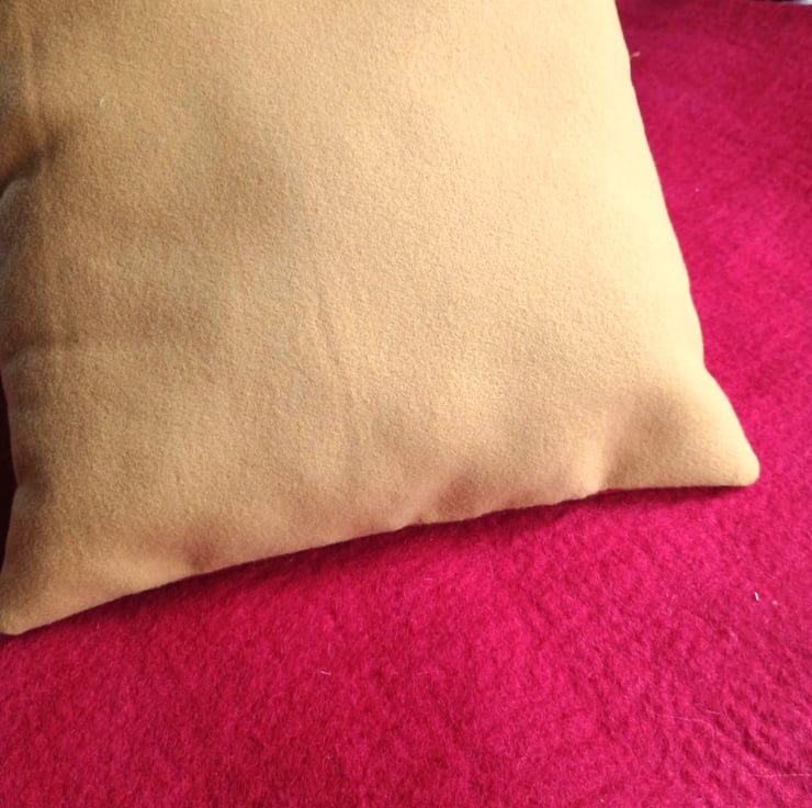 I bordered this central panel with red quilting cotton, and interlined it with wadding before machine quilting it with parallel lines of stitching. I chose a soft felted fabric for the back, in a rich golden yellow to match some of the wool felt letters.