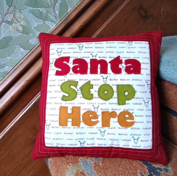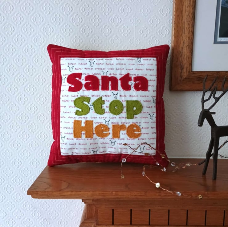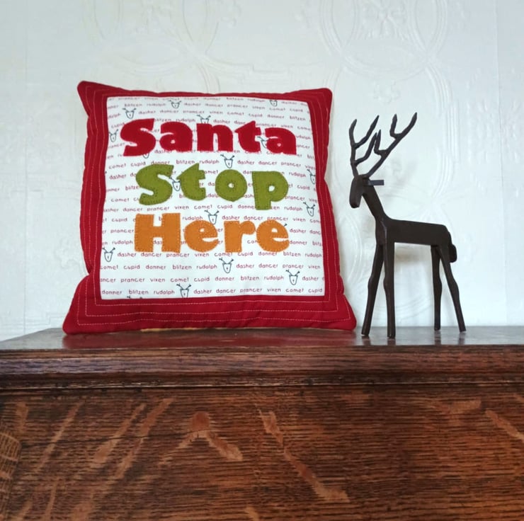 Santa Stop Here sign - a fun decorative cushion that does double duty as a reminder to Santa and his reindeer to visit your home.