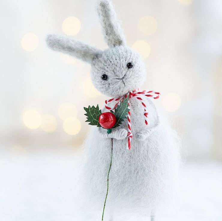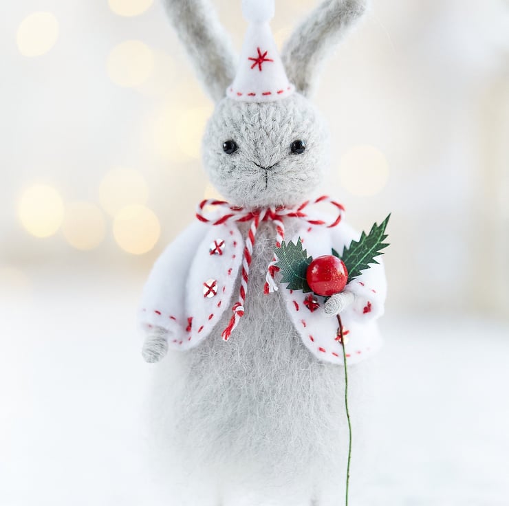 Fluffy and festive snow Bunny dressed up in fleece jacket and hat, would make a lovely gift or an elegant addition to your holiday decor.