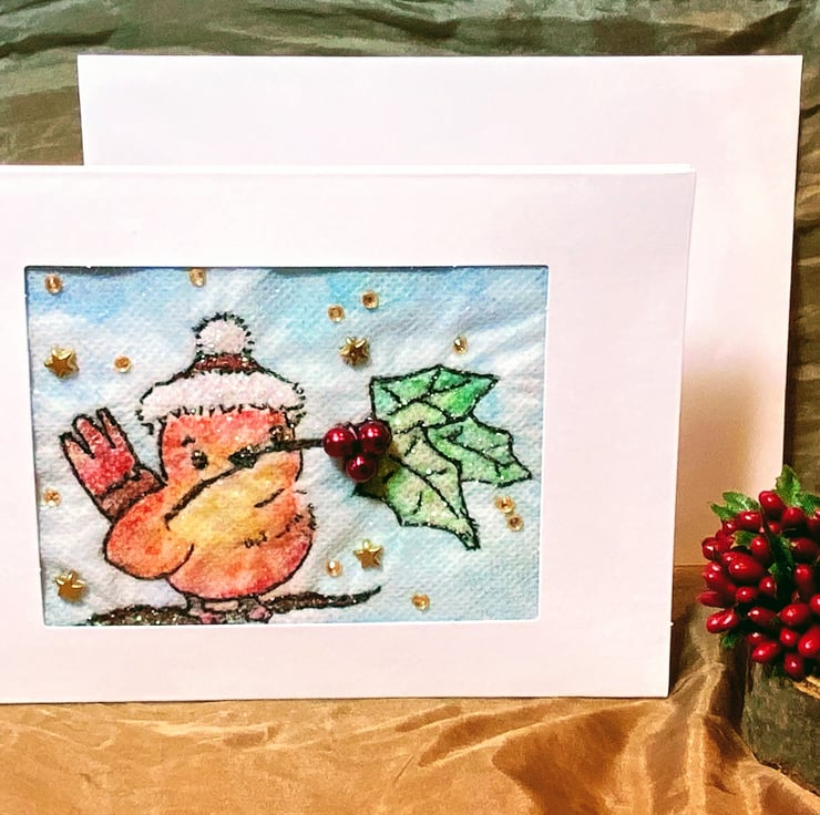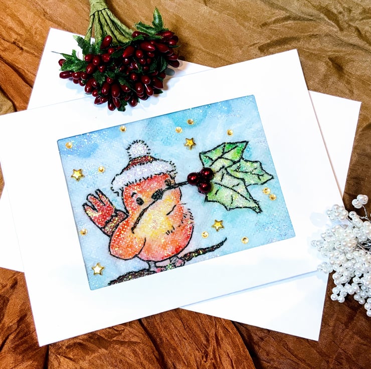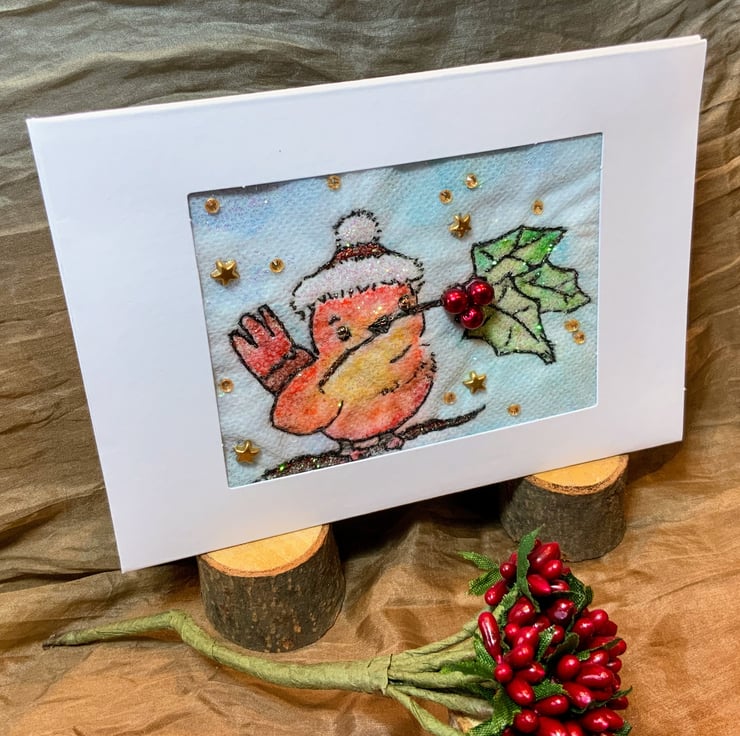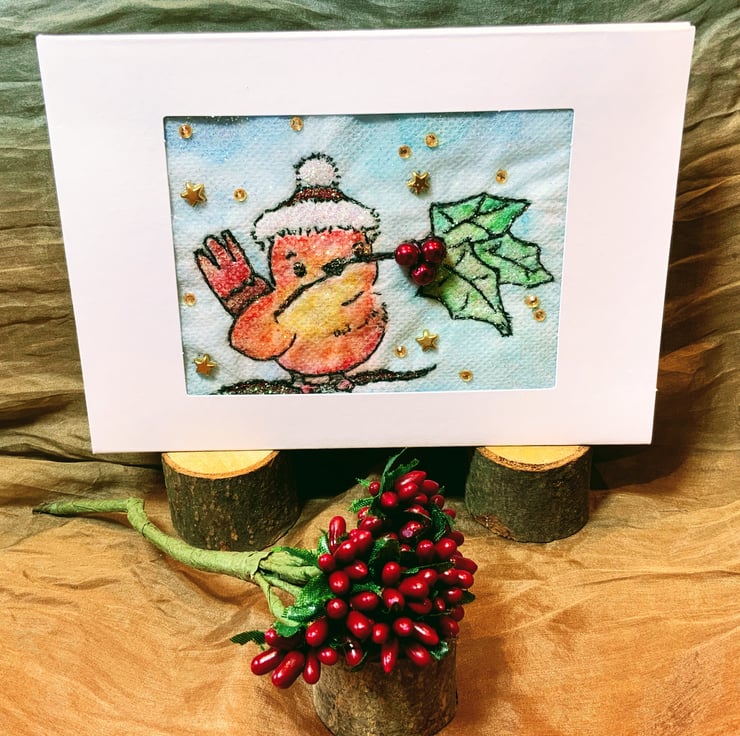Little robin is holding a holly twig with red bead berries while he perches on a little branch. Feeling very festive in his Christmas hat with pom pom, all with plenty of sparkle.