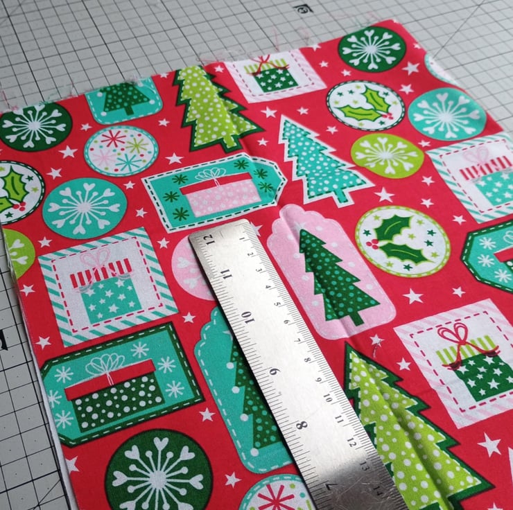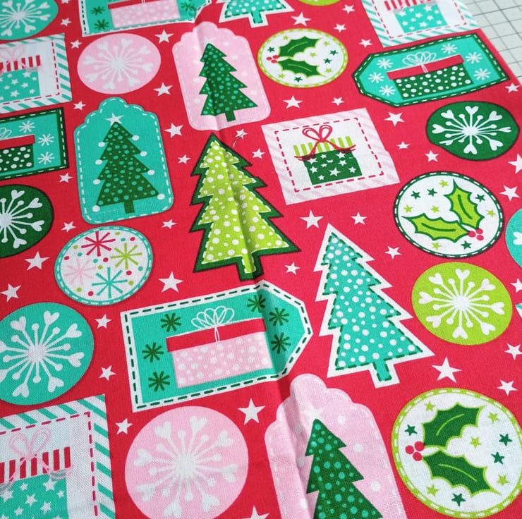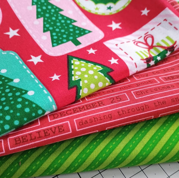 Christmas crafting - a bundle of quilting cotton fabric remnants in traditional greens and reds, with pops of pink and aqua to bring them up to date. Prints include multicoloured Christmas gift tags, mini text phrases on a red background, and a lovely bright green diagonal stripe.