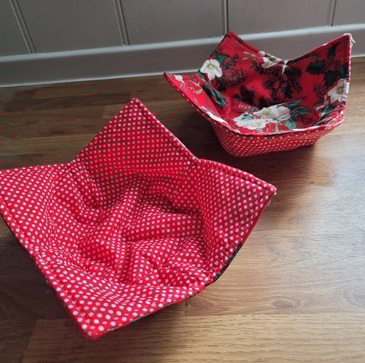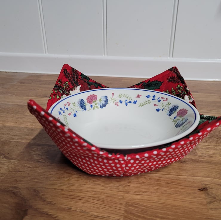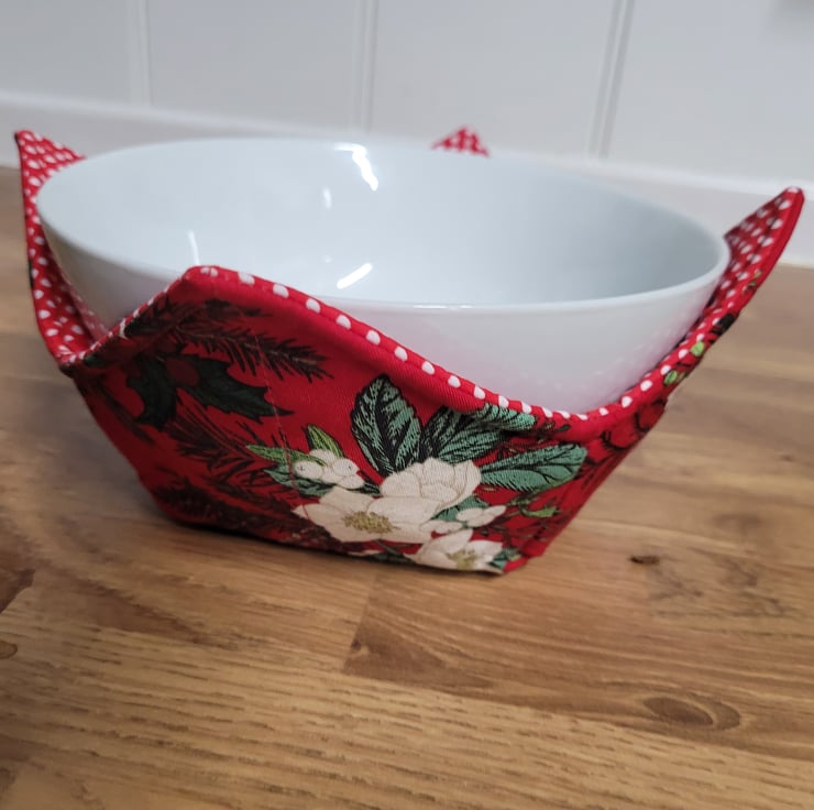 A padded fabric bowl cosy which protects your hands when carrying or holding hot bowls of soup, porridge, noodles, puddings, stir fries or any hot food. They're also great for bowls of ice cream or cold desserts. I use mine every day at breakfast for my porridge or cereal and often at lunch or dinner for anything I eat out of a bowl.
