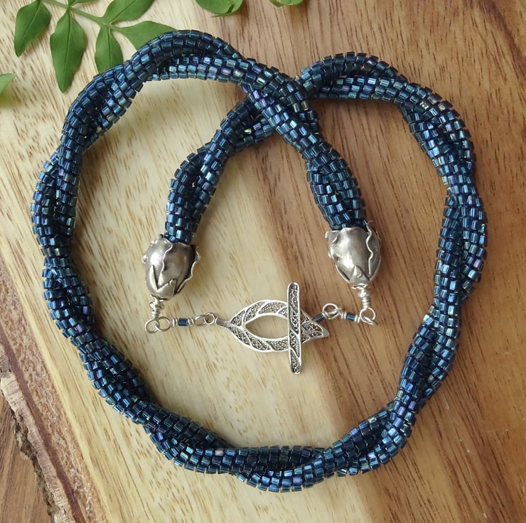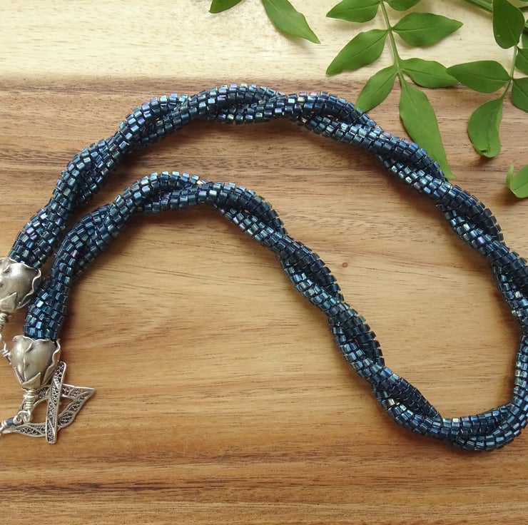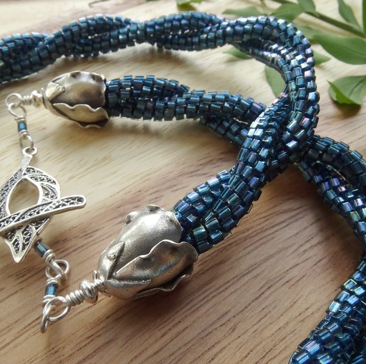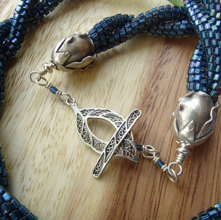 A unique piece of art, this necklace is two strands of beaded kumihimo cord twisted together to make a striking and unusual necklace. It's made using woven nylon thread so it is super strong. The beads are Miyuki Japanese glass, dark teal luster hexagons that create an unusual dragon-scale effect. The rosebud endcaps are fine silver made by Karen Hill Tribe, the leaf-shaped toggle fastening is sterling silver, and together they are stunning enough to be worn as the focal point! If you (or someone you love) wants to feel stunning, dramatic and a little bit dark, this is the necklace for you.