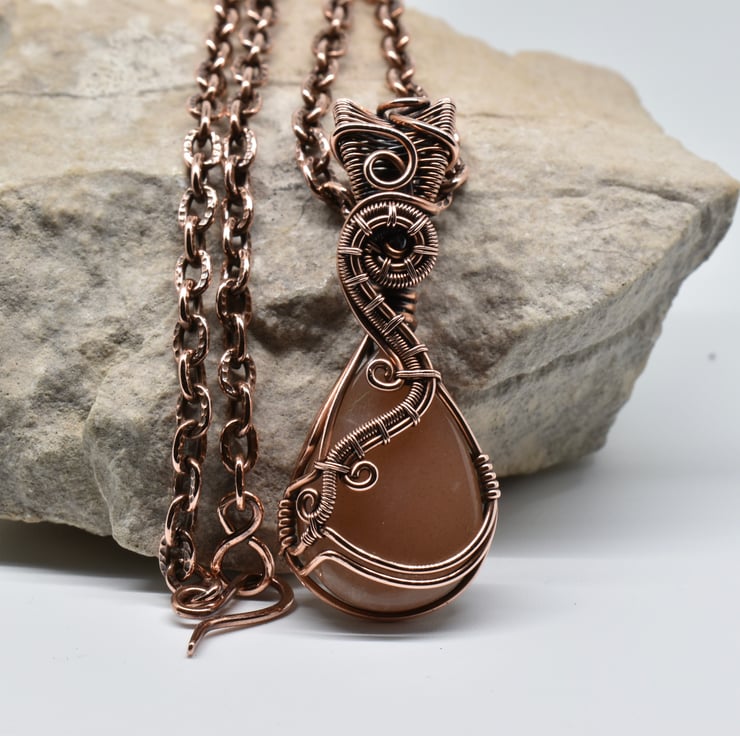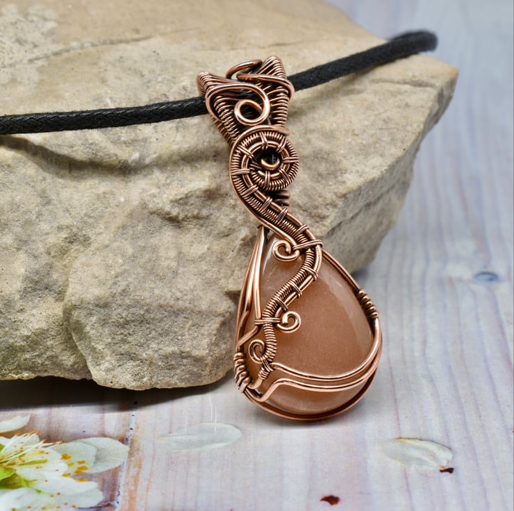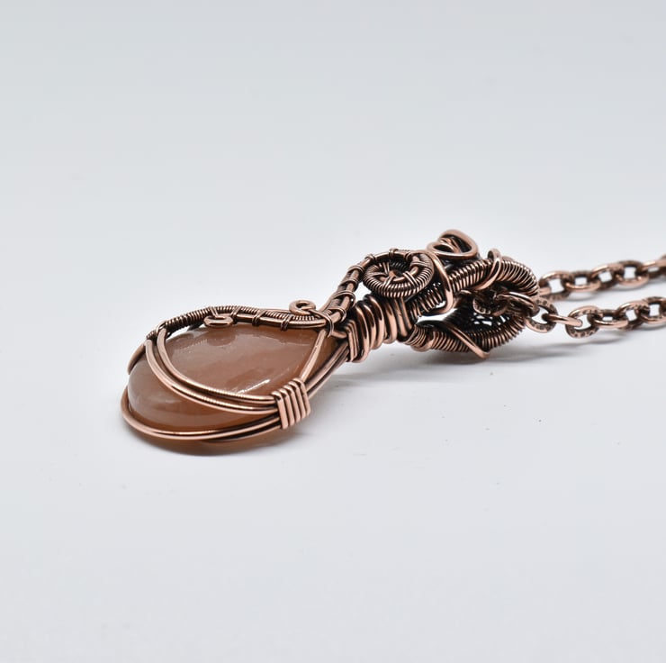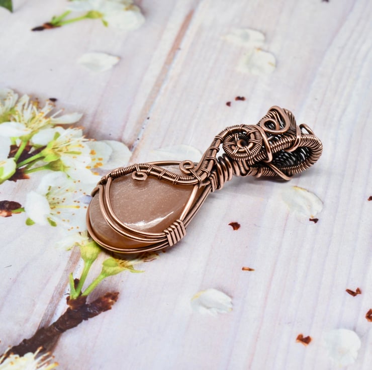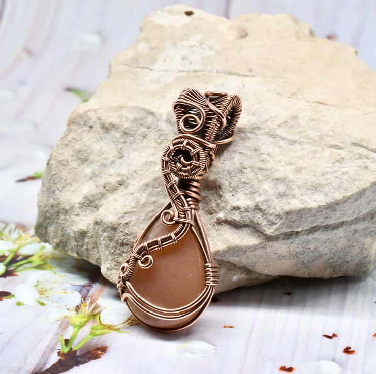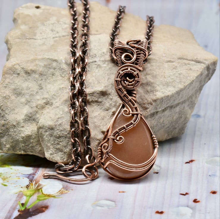 A pretty peach moonstone I have wrapped and woven using solid copper wire to make this lovely pendant.