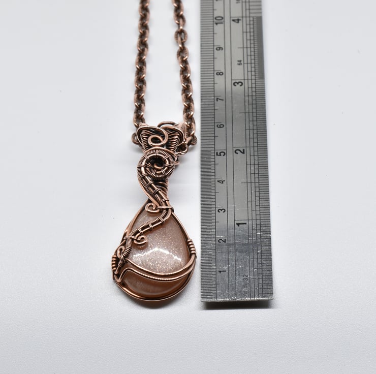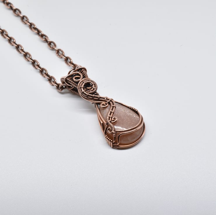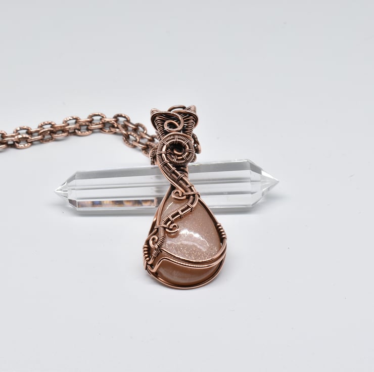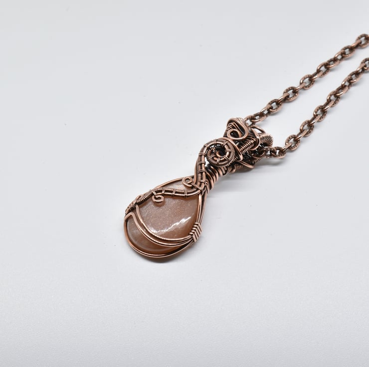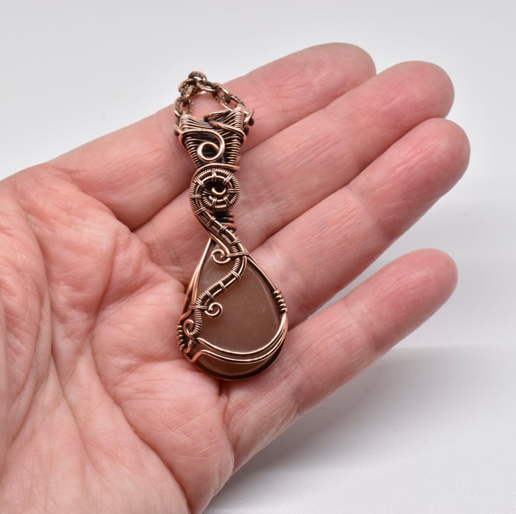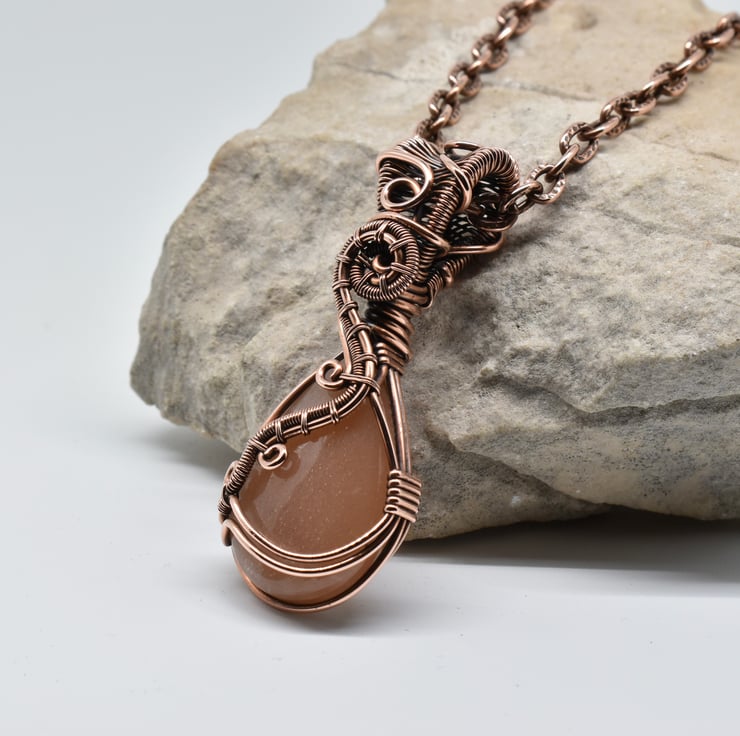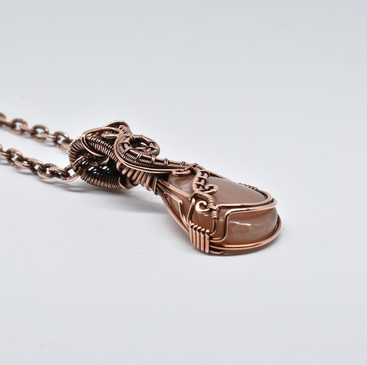 A pretty peach moonstone I have wrapped and woven using solid copper wire to make this lovely pendant.