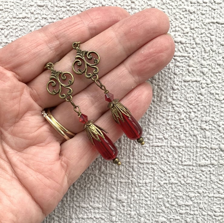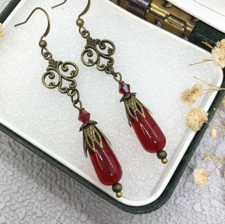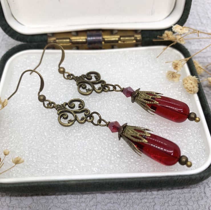 These charming vintage style earrings are made with antique bronze Art Nouveau style connectors that have deep red glass teardrop beads that are decorated with bronze tone bead caps. The earrings are finished with antique bronze earring hooks. The earrings are 6.5cm in total length.