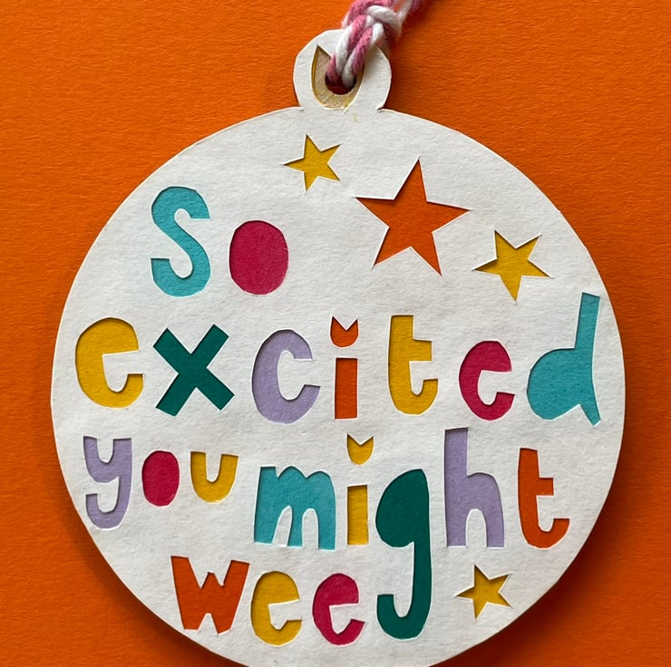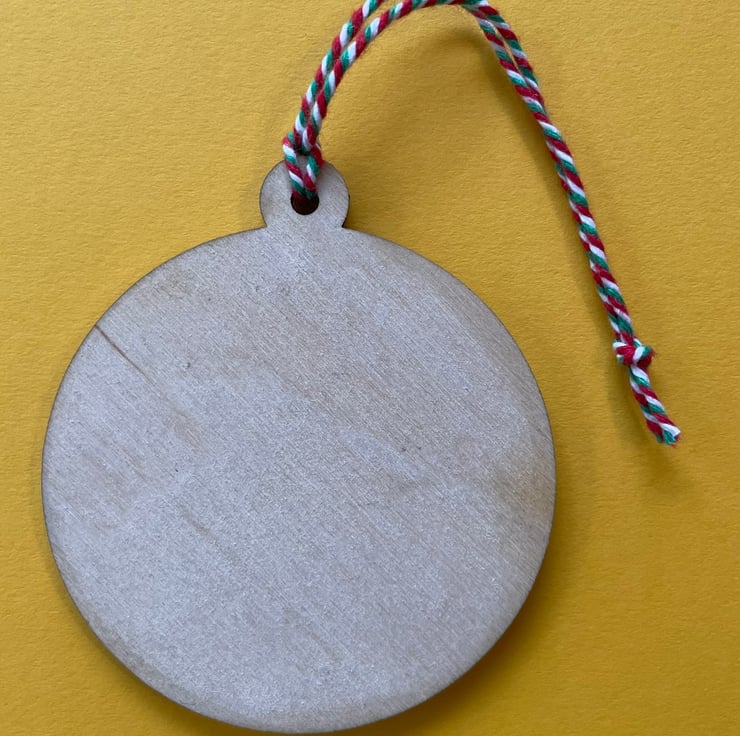 This decoration is fully designed and made by hand. The design is cut by hand into white paper and layered with contrasting coloured paper to show the words and patterns. The papercut is then applied to a wooden bauble shape and varnished to protect it. Finally a length of pink and white string is added.