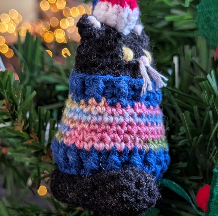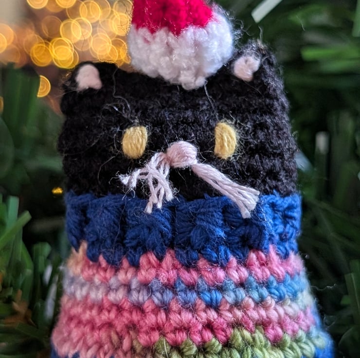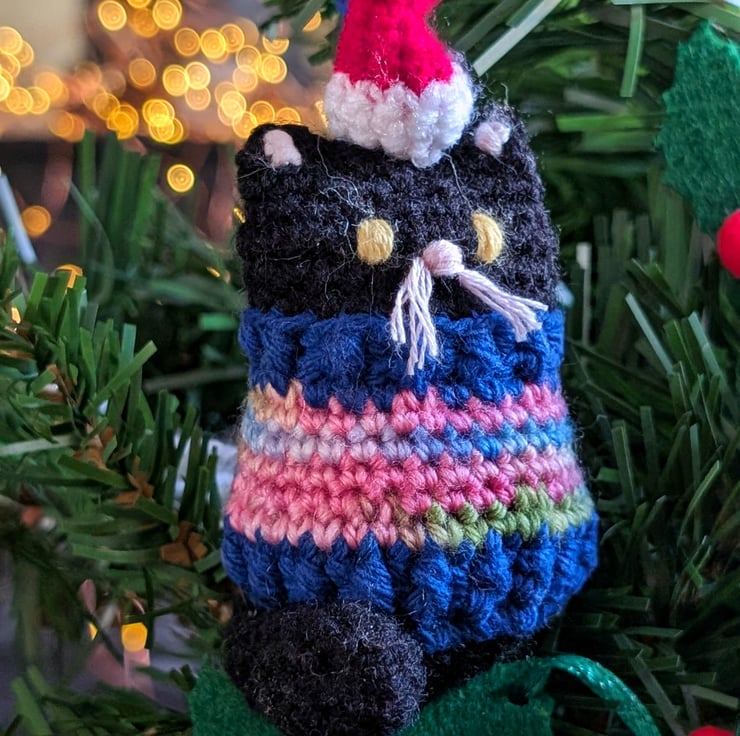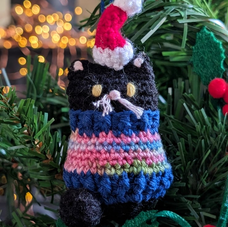 A black cat Christmas tree decoration, complete with Santa hat and rainbow jumper! Makes a purrfect Christmas gift for cat lovers, handmade from upcycled and recycled materials.