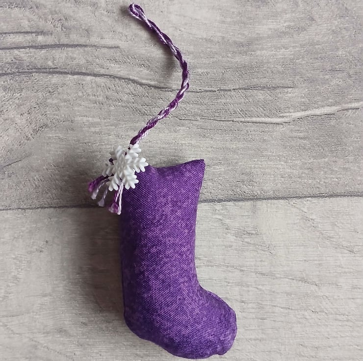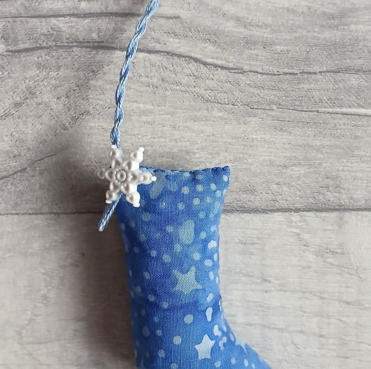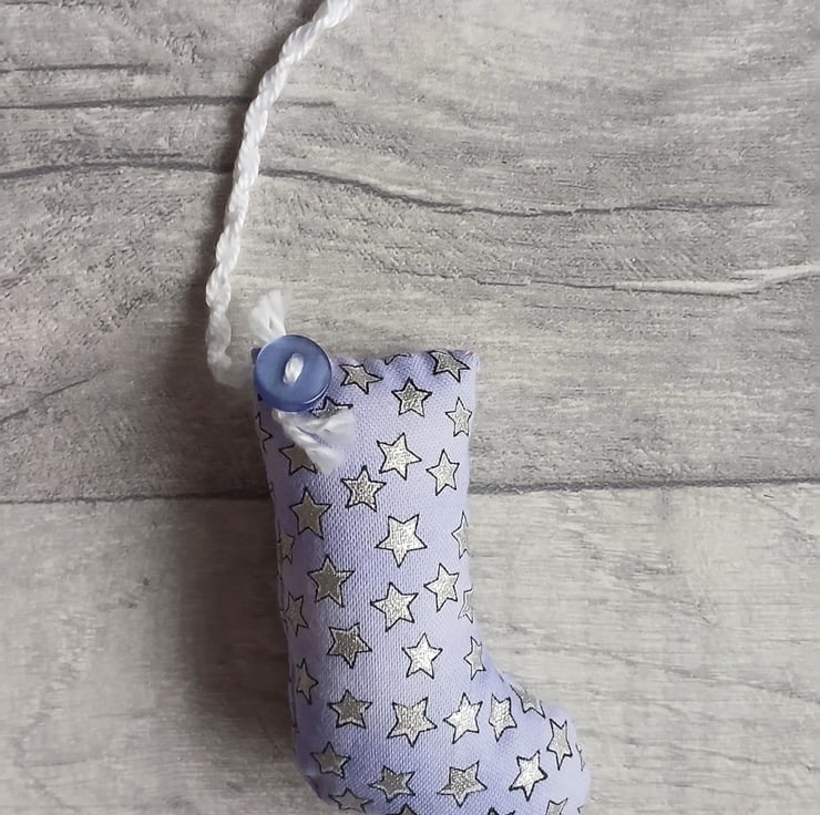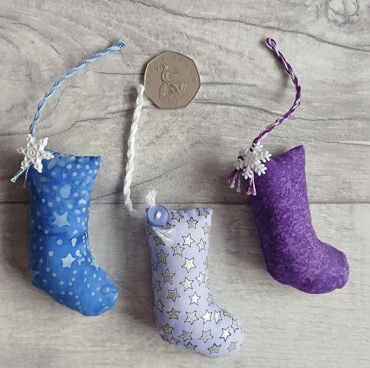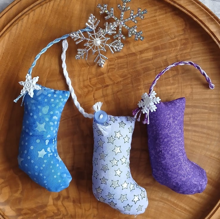 Three frost hued mini Christmas stocking decorations made from scrapbox snippets and finished with coordinating buttons and twisted thread hanging loops - each set is unique and this set comprises: