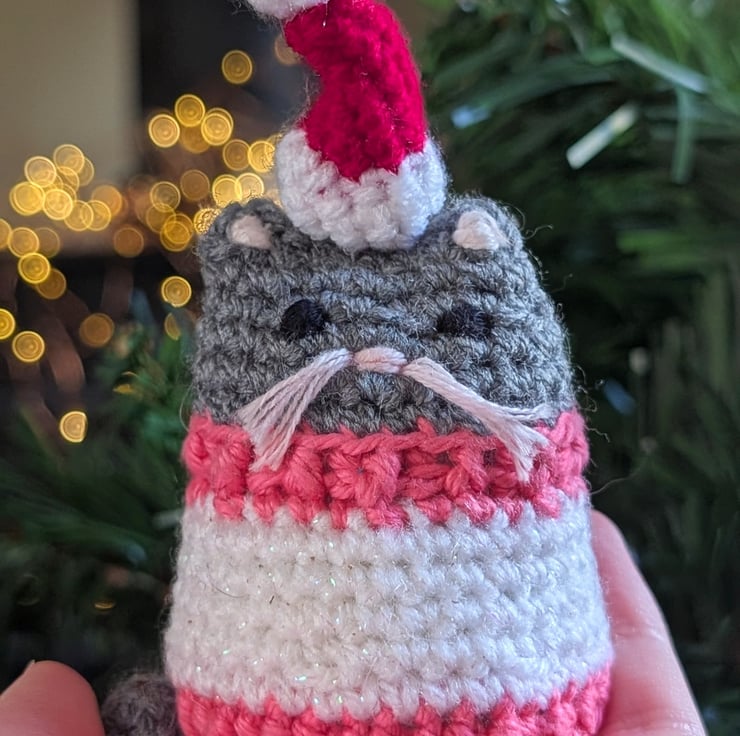 A grey cat Christmas tree decoration, complete with Santa hat and white glittery jumper! Makes a purrfect Christmas gift for cat lovers, handmade from upcycled and recycled materials.