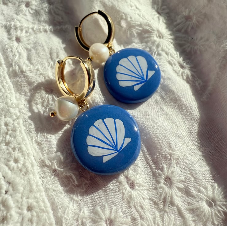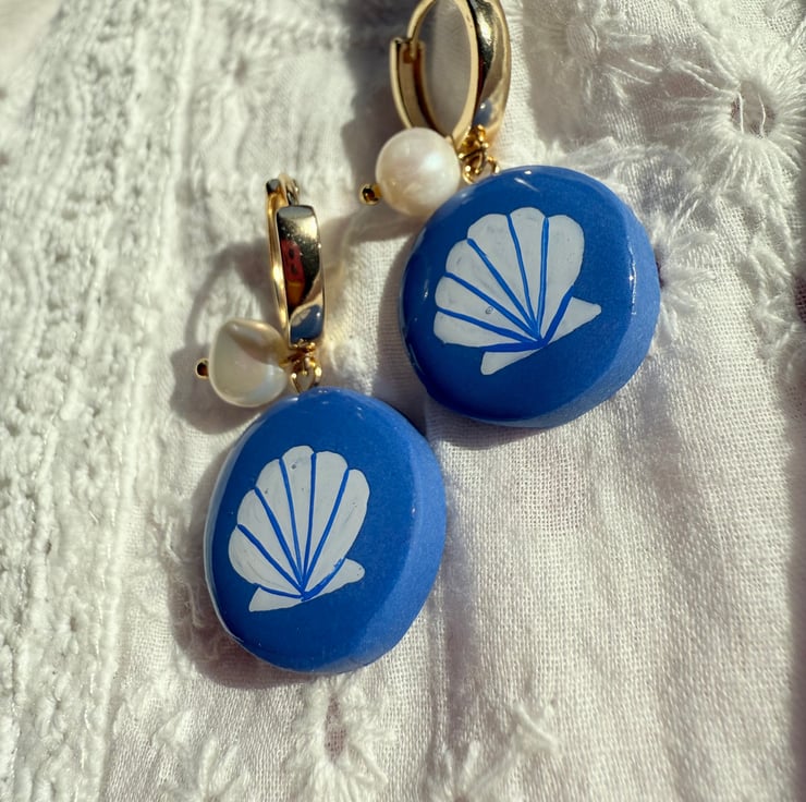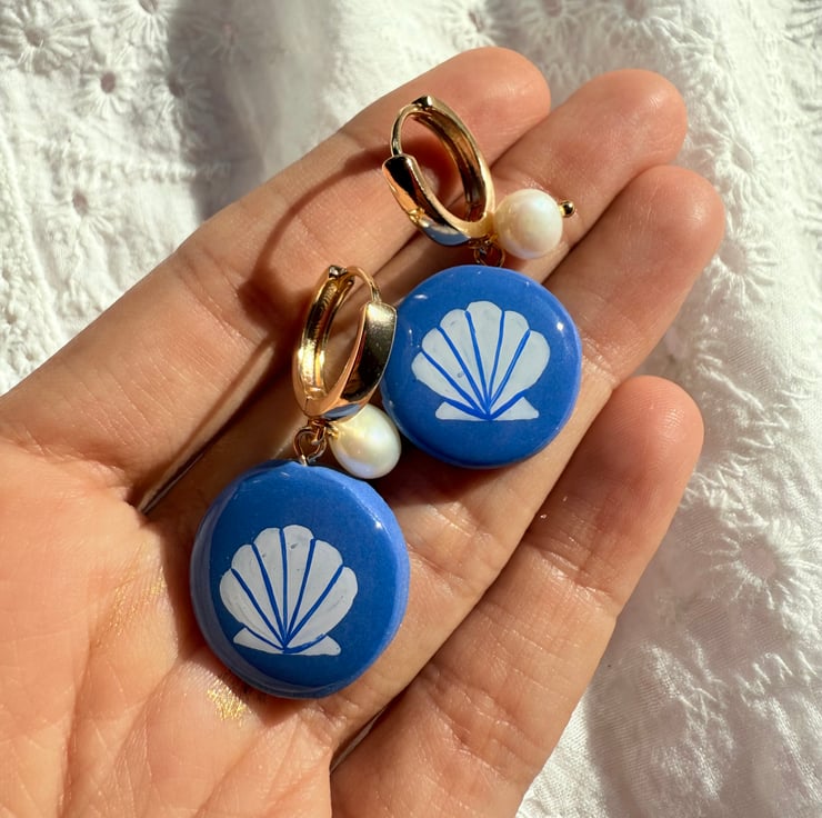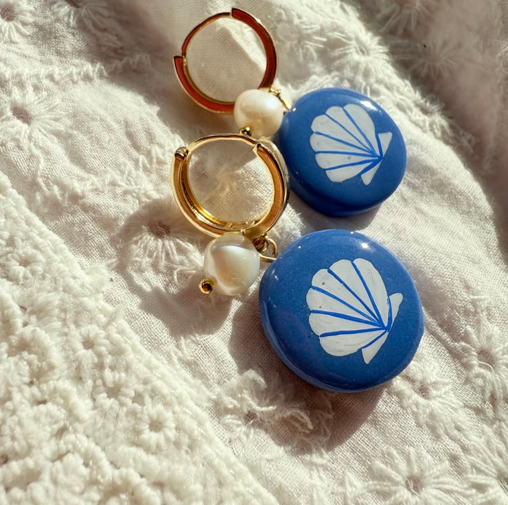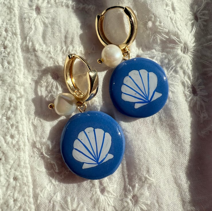 These blue seashell earrings are hand-painted and finished with a freshwater pearl accent. Set on 18K gold plated hoops, they are lightweight, comfortable, and perfect for everyday wear or as a seaside-inspired statement piece.