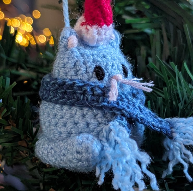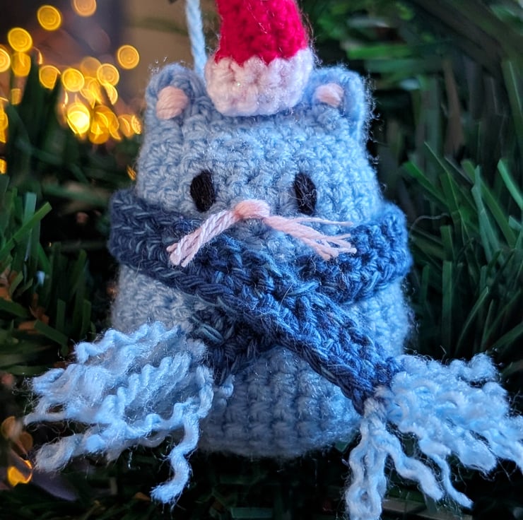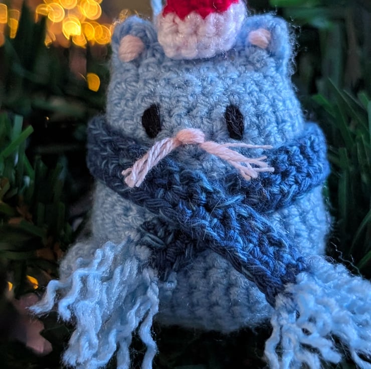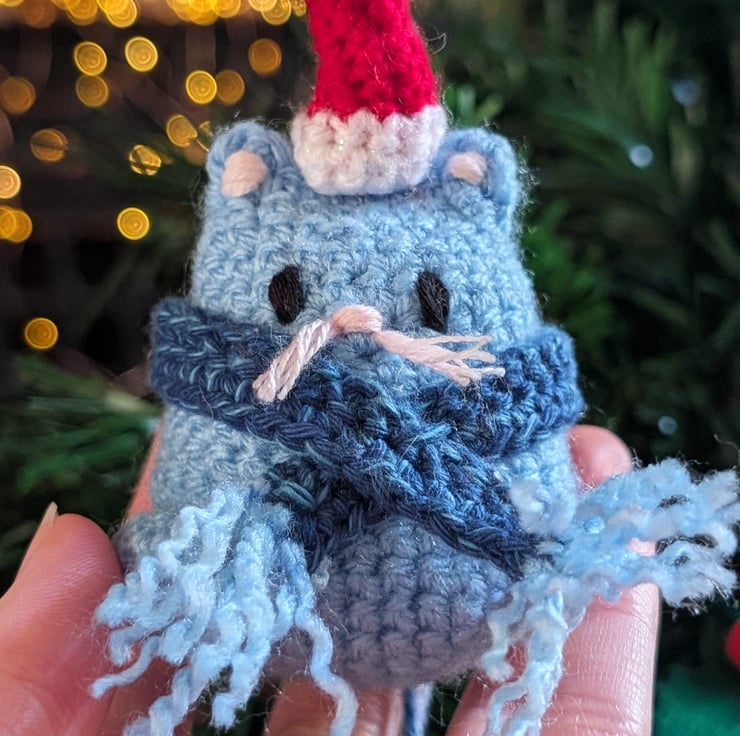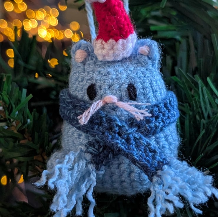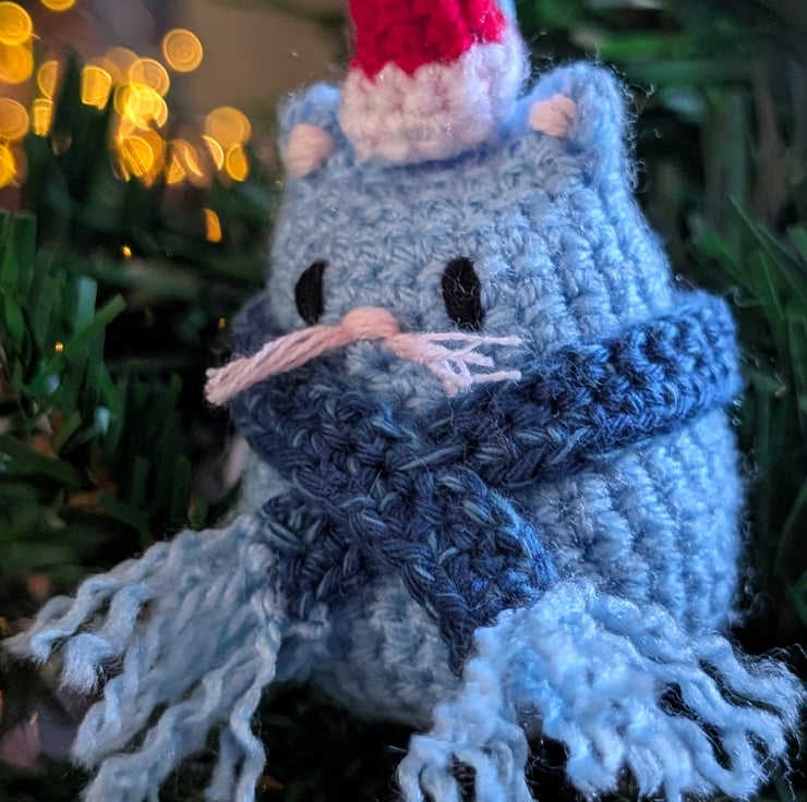 A wintery blue cat Christmas tree decoration, complete with glittery Santa hat and blue scarf! Makes a purrfect Christmas gift for cat lovers, handmade from upcycled and recycled materials.
