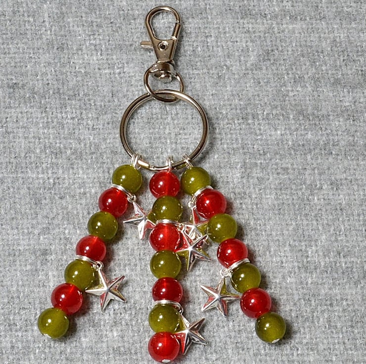 Three dangles made from red and green glass beads, interspersed with silver-plated star charms, give this bag charm a cheerful and Christmassy feel. The bag charm measures approximately 8cm, or 3 1/4 inches in length, and is attached to a silver-coloured lobster clasp/lanyard clip.