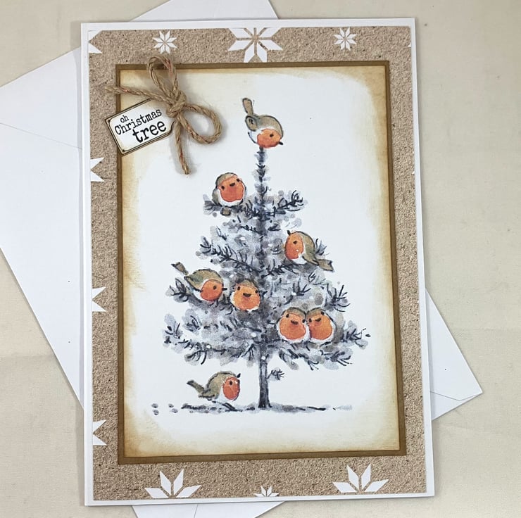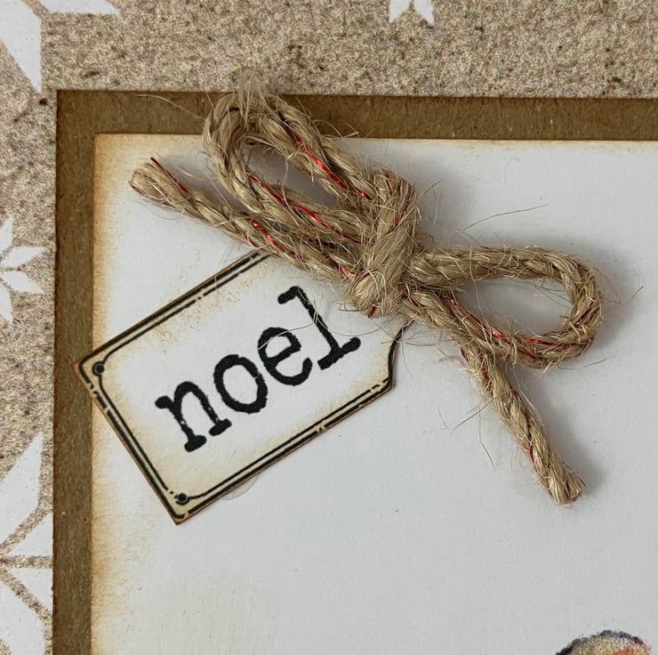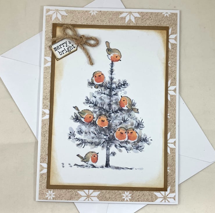 Pack of 3 Christmas cards, each with the same printed image of cute robins in a tree. The image has been inked around the edges with distress ink and mounted onto kraft card over a beige and white snowflake background. Each card has been finished with a small tag with a Christmas message (noel, merry & bright and oh Christmas tree) and a small jute string bow.