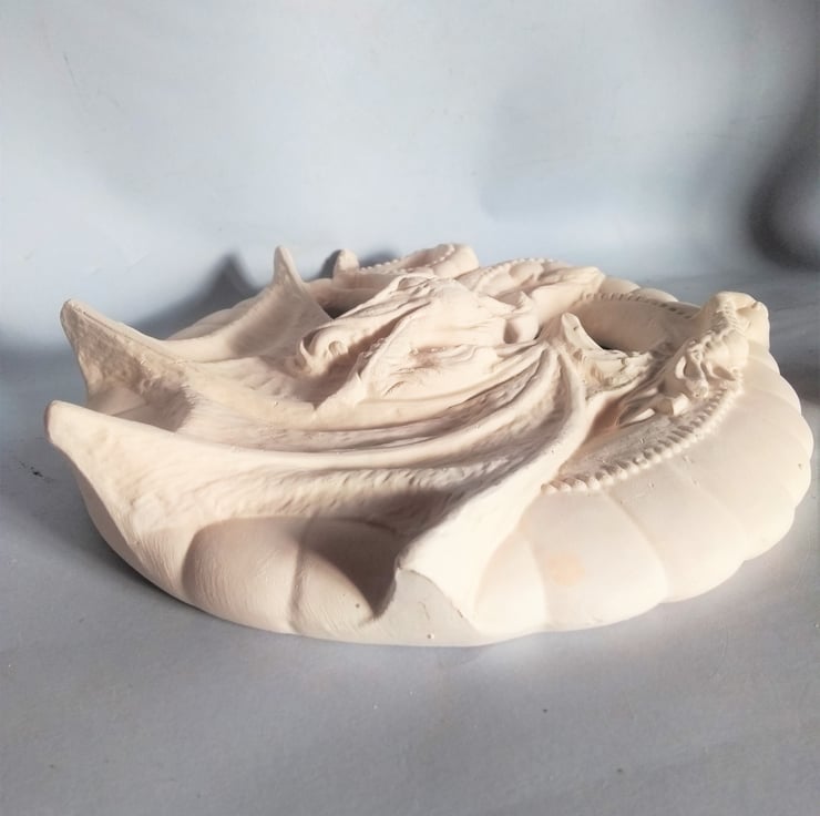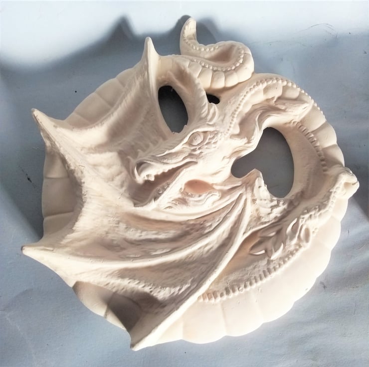 This Dragon plaque was cast from a rare American mold by Penarth Ceramics in an earthenware clay, prepared and bisque fired to produce this hanging plaque. Suits Adults or kids from 6 years to paint. The set includes 6 acrylic colors. red, yellow, blue, black, white and gold. Measuring 20.5 cms diameter x 3 cms depth.There are holes in the back to adapt to hanging on the wall.