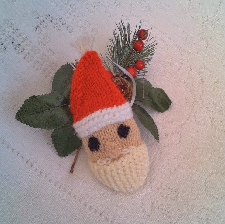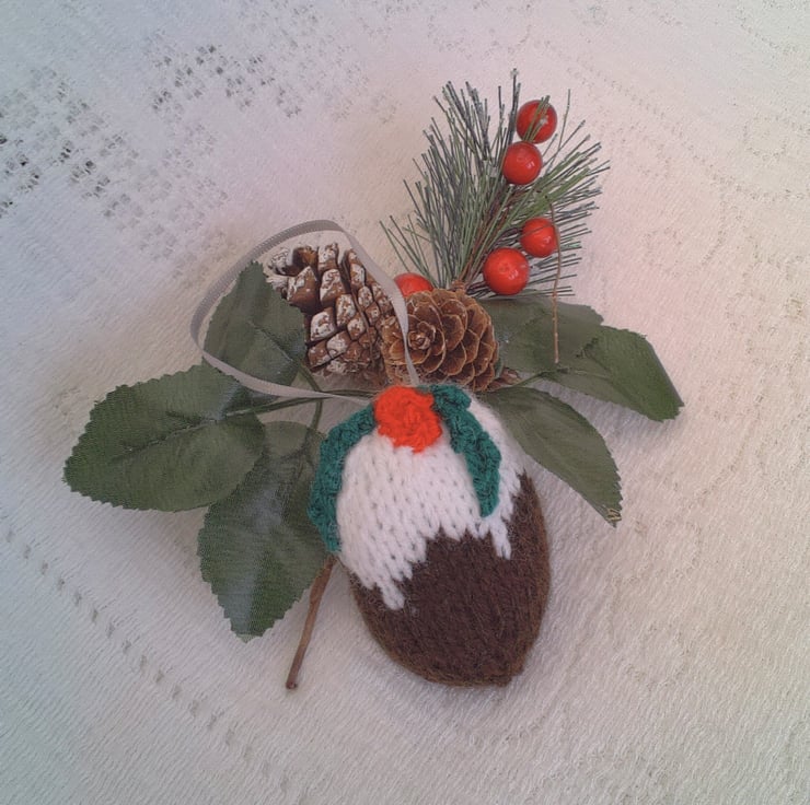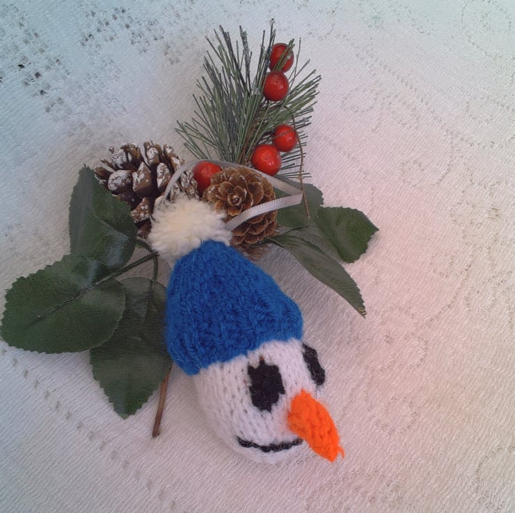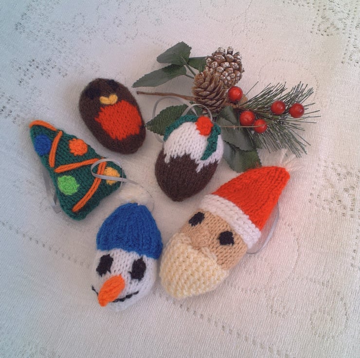 This set of 5 Christmas tree decorations is hand knitted in double knitting weight yarn. The set features Santa, snowman, Christmas tree, Robin and a Christmas pudding. Each decoration can be hung on your tree with the attached ribbon and the top.