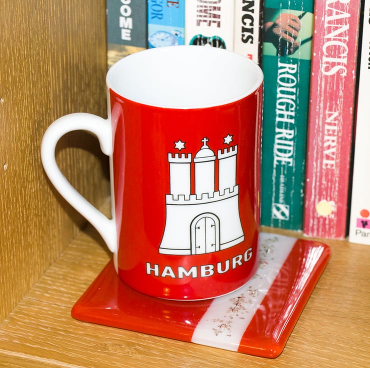 A square of Red glass is divided by a stripe of white glass with silver-coloured metal flakes embedded within.. It is approximately 10 cm square and has little rubber feet fixed to the base to stop it from slipping around.