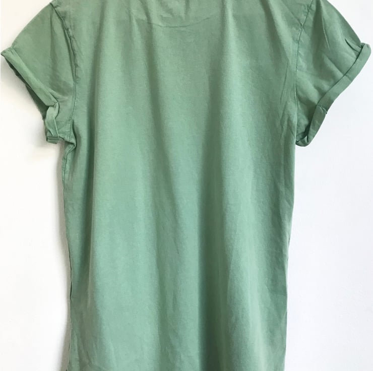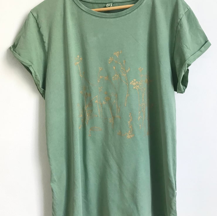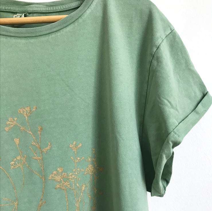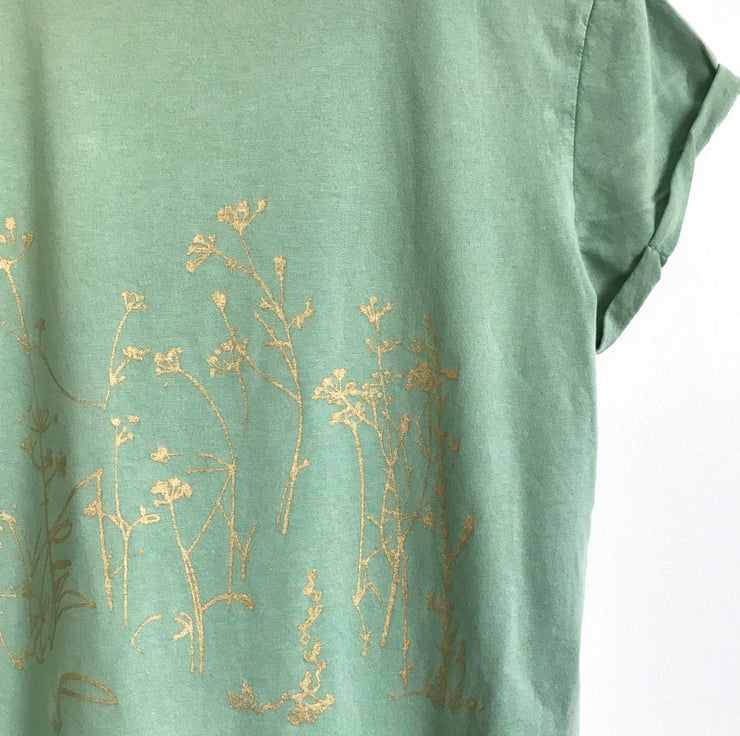 Womens organic cotton stonewash sage green T shirt Wild Meadow gold print