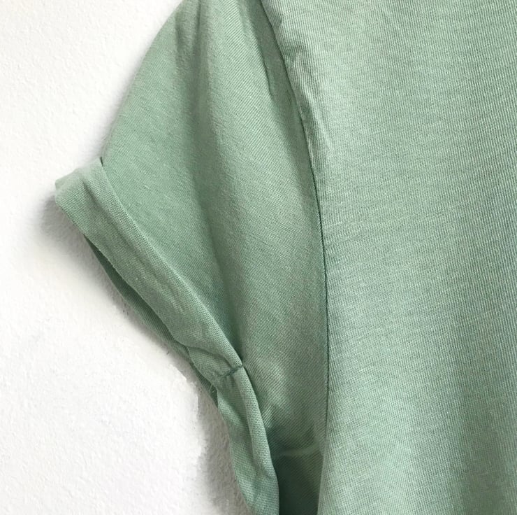 Short rolled sleeve, rounded crew neckline, looser fit than our bamboo tees, length to over hips, curved hemline.